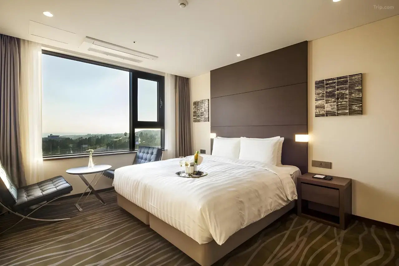 디럭스 룸은 보다 넓은 공간과 고급스러운 인테리어가 특징입니다. 제주도의 아름다운 전망을 감상할 수 있는 창이 있어 커플 여행객이나 신혼여행객에게 인기가 많습니다.
