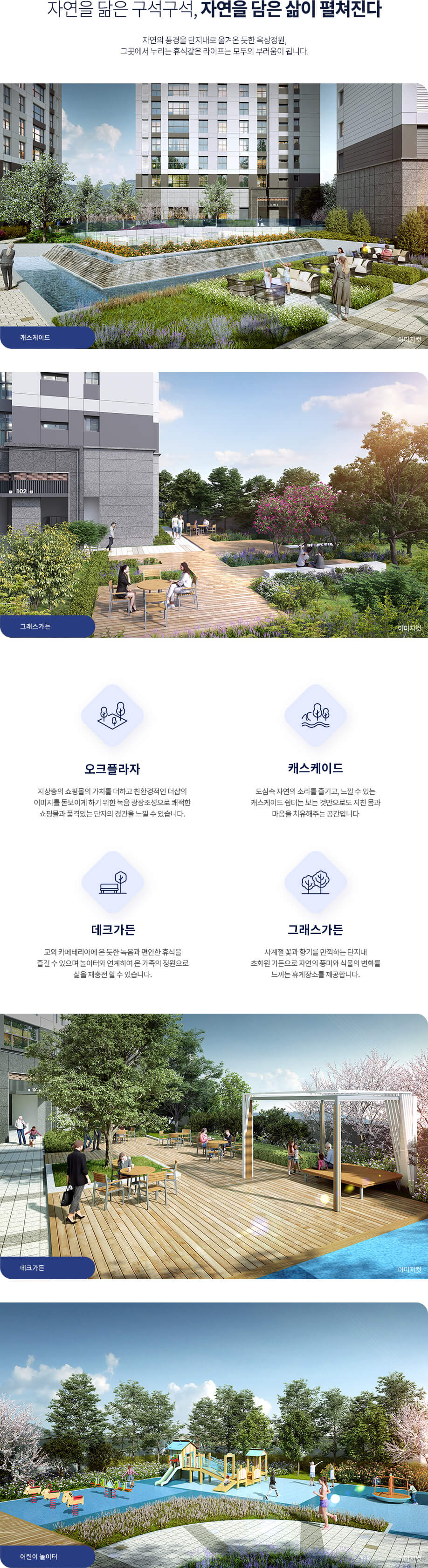 - 캐스케이드 쉼터, 그래스 가든, 데크 가든 등의 테마형 조경은 일상 속 힐링 요소로 작용합니다.