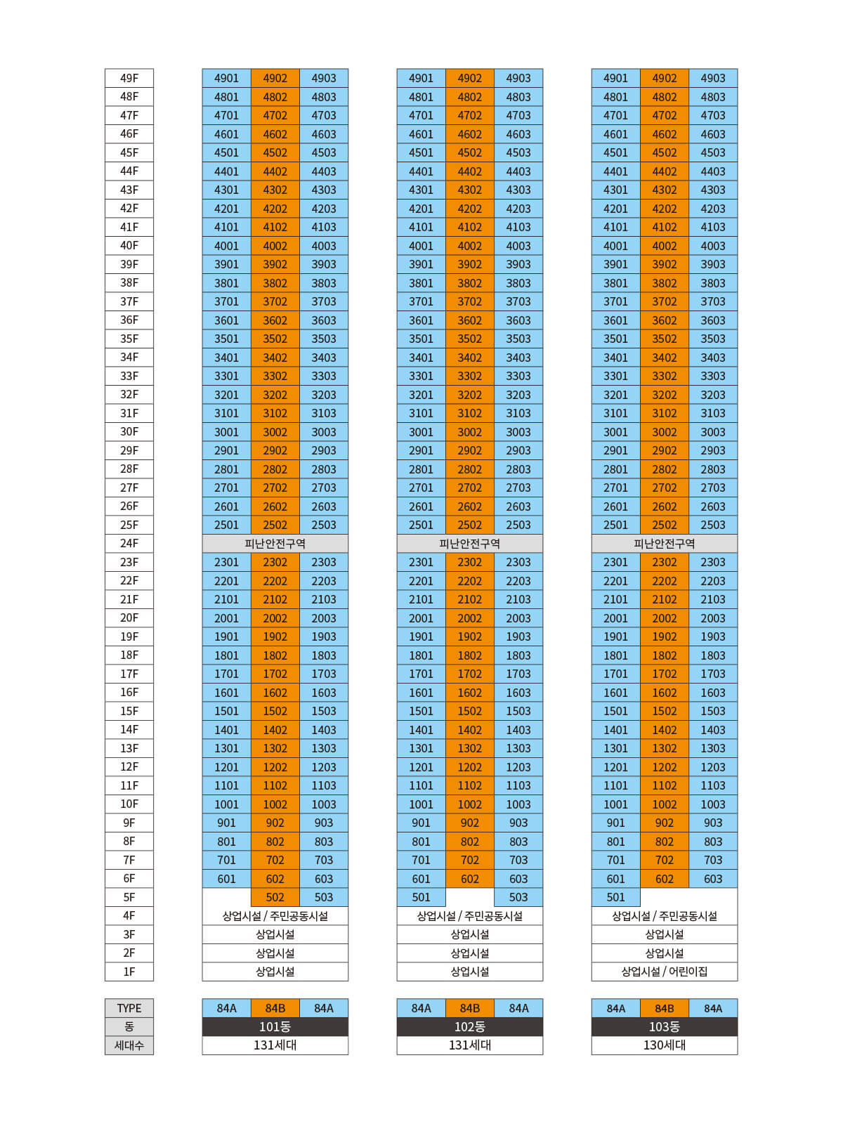 - 84B 타입은 타워형 구조로 실간 독립성을 강조했습니다. LD/K 구조를 통해 거실과 주방을 분리하고, 실내 프라이버시를 확보했으며, 이 역시 넉넉한 수납공간이 마련되어 있습니다.