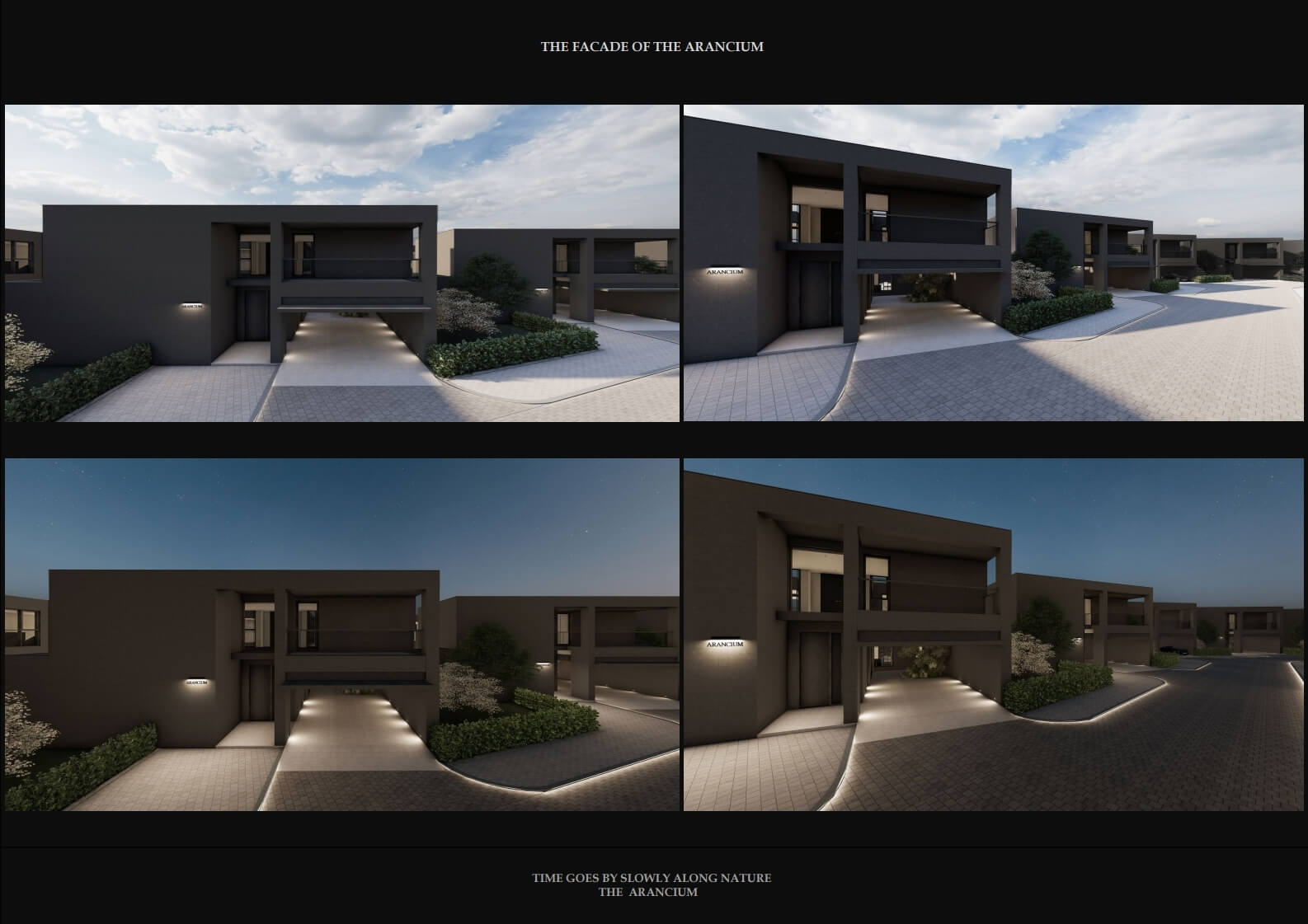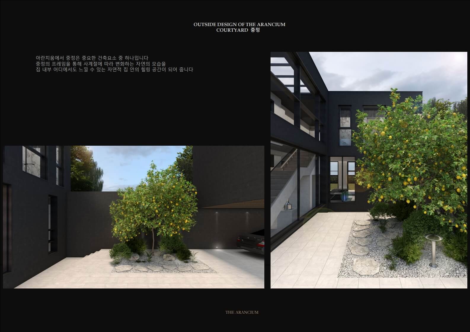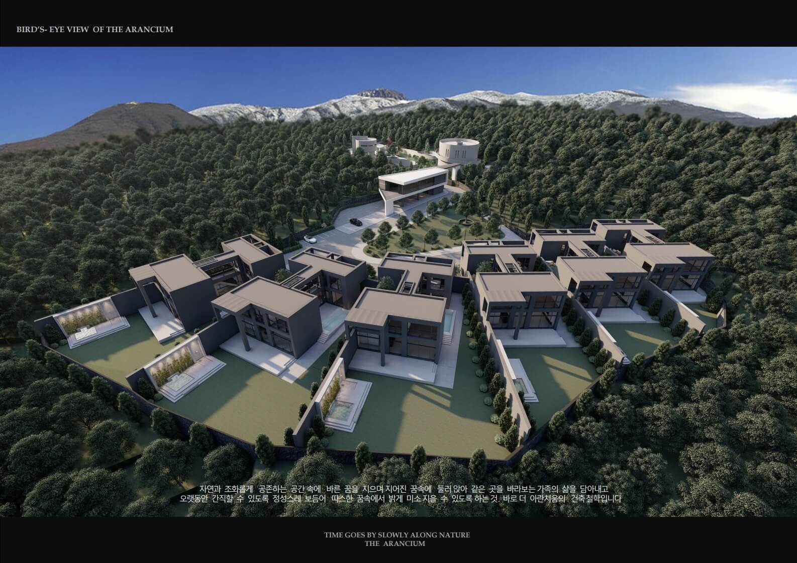 더 아란치움의 이름은 라틴어로 "황금빛 오렌지"를 의미합니다. 이는 "풍요로운 대지와 삶의 번영"을 상징하며, 성공을 이뤄낸 뒤 마주하는 평화로운 안식처를 의미합니다. 제주도 단독주택의 새로운 기준을 세우는 더 아란치움은 삶의 가치를 높이는 고급 타운하우스입니다.