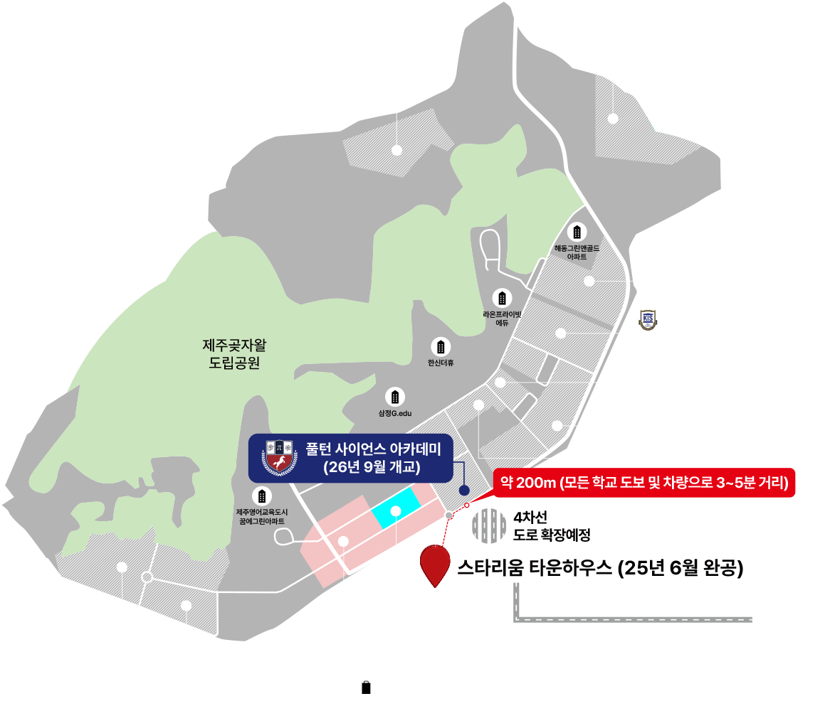 스타리움은 제주 영어교육도시에서 가장 가까운 고급 타운하우스 중 하나로, 도보로 3분 거리(300m)에 풀턴 사이언스 아카데미 애서튼이 위치하고 있습니다. 이 외에도 국제학교 4곳이 차량 5분 거리 내에 있어 국제학교 학부모들에게 특히 매력적입니다.