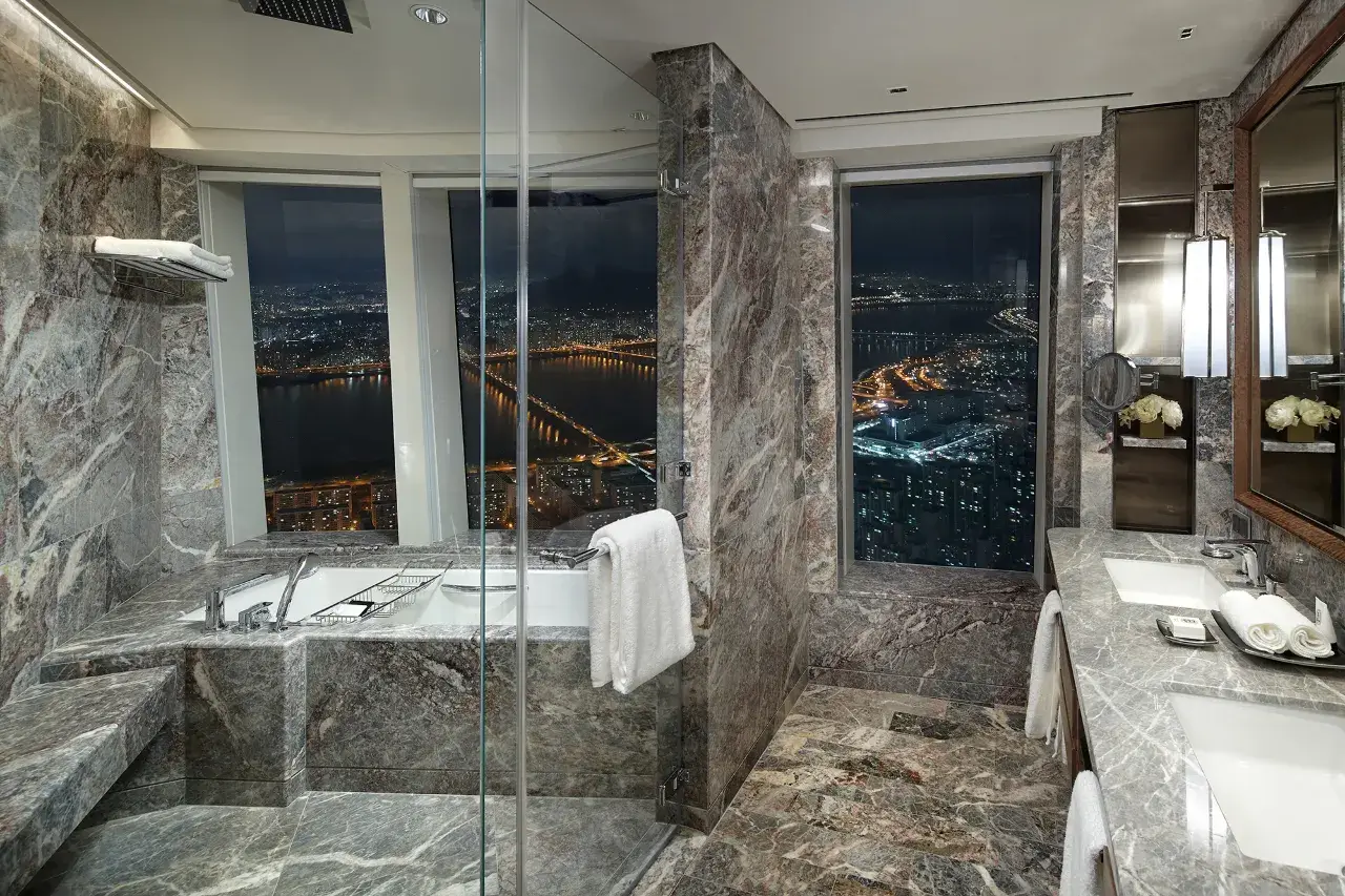 하지만 시그니엘은 2017년 오픈한 비교적 신축 호텔이고 객실 컨디션 관리가 뛰어나서, 특히 ‘집중 휴식’을 원하는 고객들이 만족감을 크게 느낍니다. 또한 욕실이 넓고 전신 욕조 + 샤워부스가 분리되어 있어, 여행의 피로를 확실하게 풀어주는 구조입니다.