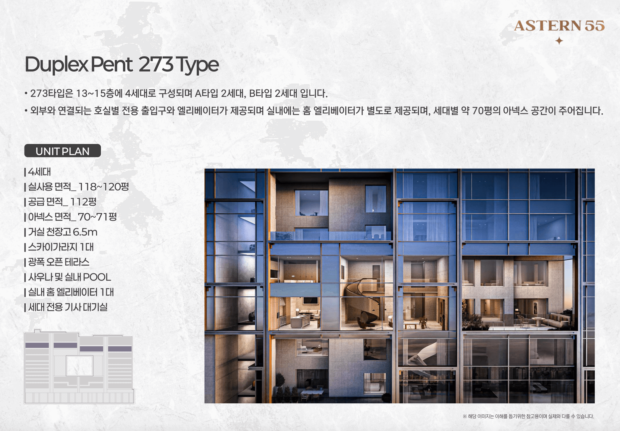 - 듀플렉스 펜트는 개별 수영장과 사우나, 스카이가라지를 갖춘 리조트형 구조