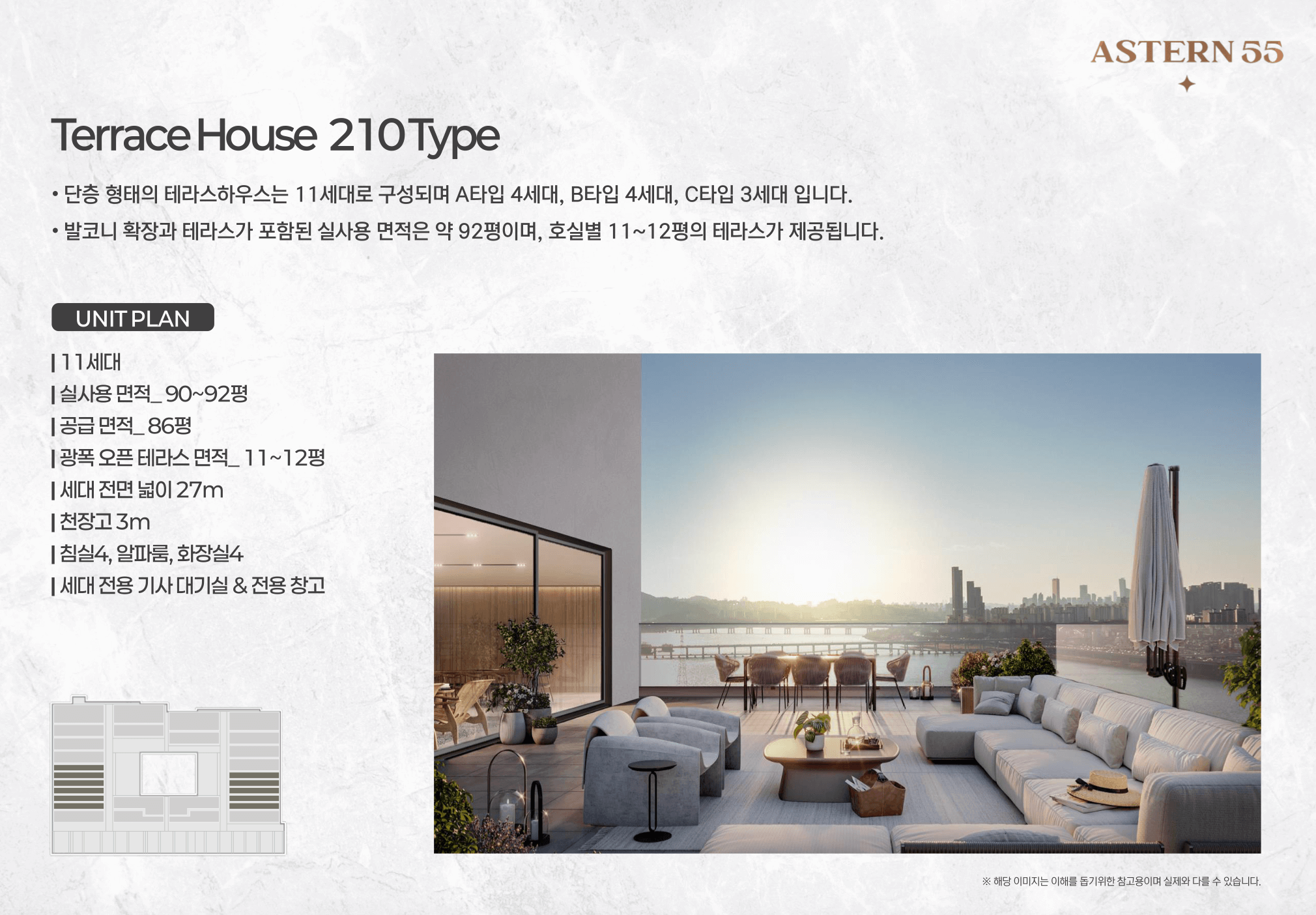 - 테라스 하우스는 90평 이상의 실내공간과 12평 수준의 넓은 테라스를 제공