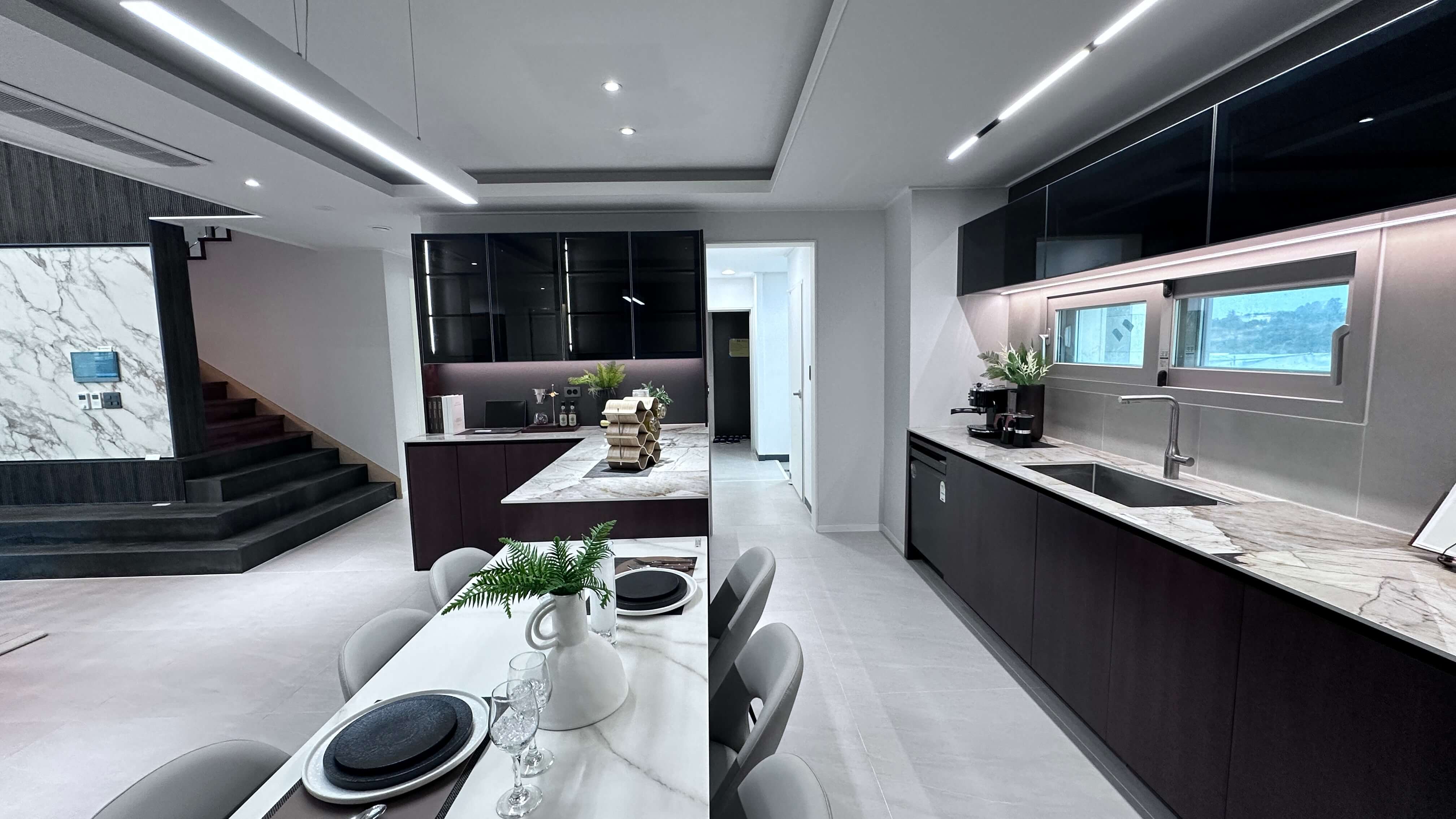 가장 눈길을 끄는 부분은 압도적인 서비스 면적입니다. 타입에 따라 최소 11평에서 최대 83평에 달하는 서비스 면적이 제공되어 실사용 공간이 매우 넓습니다. 2.6m의 높은 천정고는 실내에 들어섰을 때 탁 트인 개방감을 선사하며, 최상층 다락 공간은 아이들의 놀이방이나 개인 영화관으로 활용하기에 충분한 높이를 확보했습니다. 또한 주방에는 LG 인덕션, 식기세척기, 광파오븐 등 프리미엄 가전이 무상 옵션으로 제공되어 입주민의 품격을 높여줍니다.