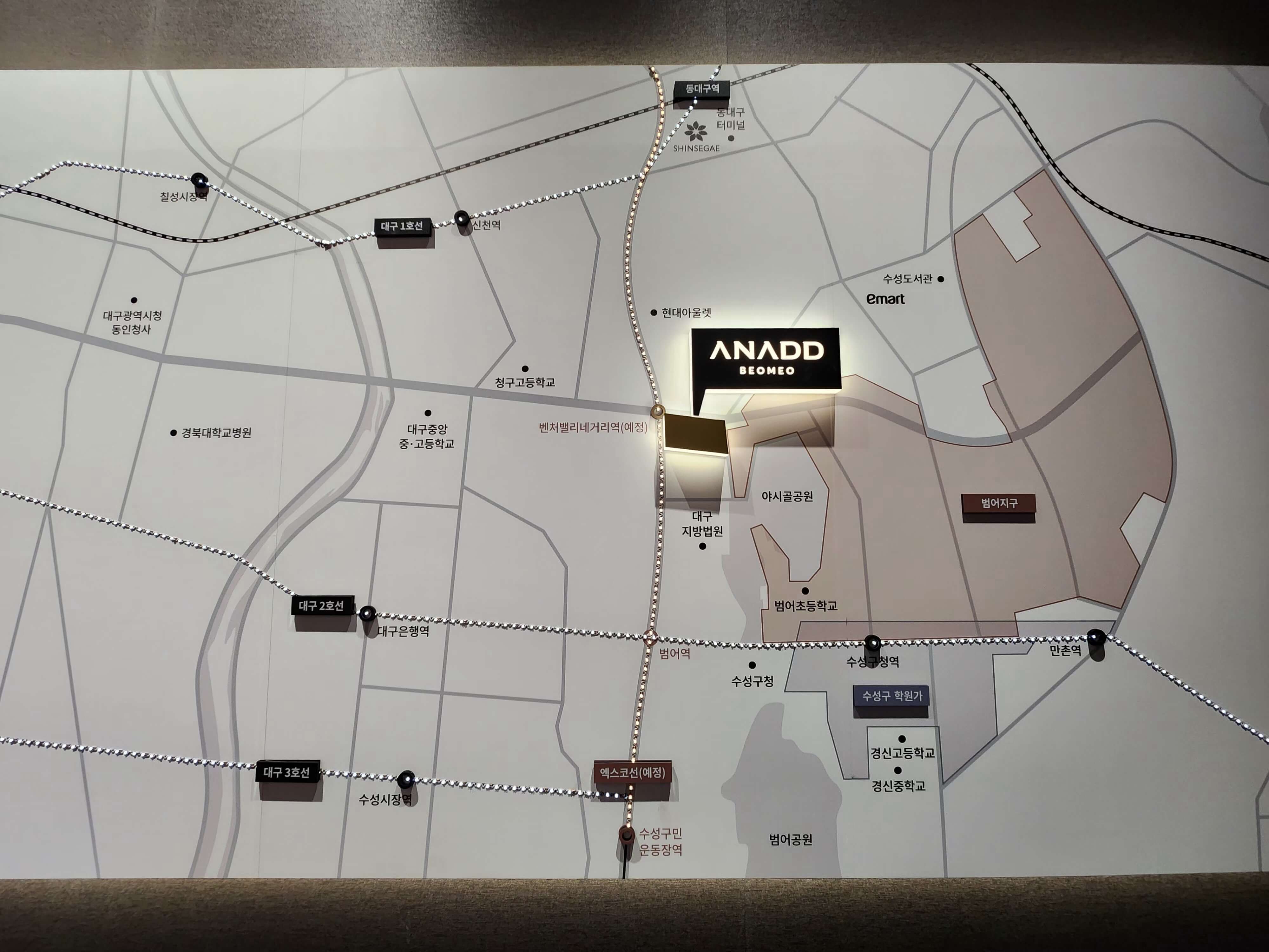 어나드범어는 옛 MBC 부지에 자리잡아 상징성이 남다릅니다. 도심과 가까워 생활 인프라 접근성이 탁월하고, 범어네거리·신세계백화점·대형마트·병원 등이 차량 10분 내에 밀집해 있습니다. 뿐만 아니라 지방법원과 행정타운이 가까워 행정 편의성까지 누릴 수 있죠.