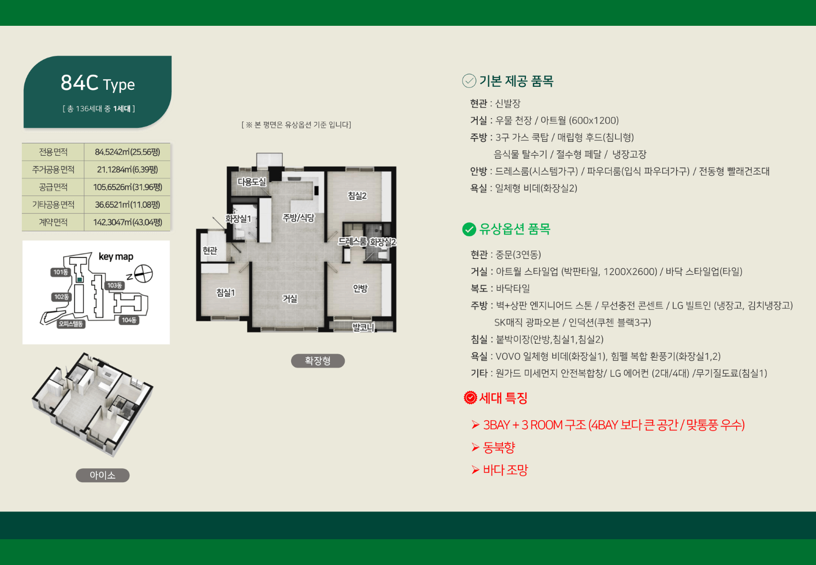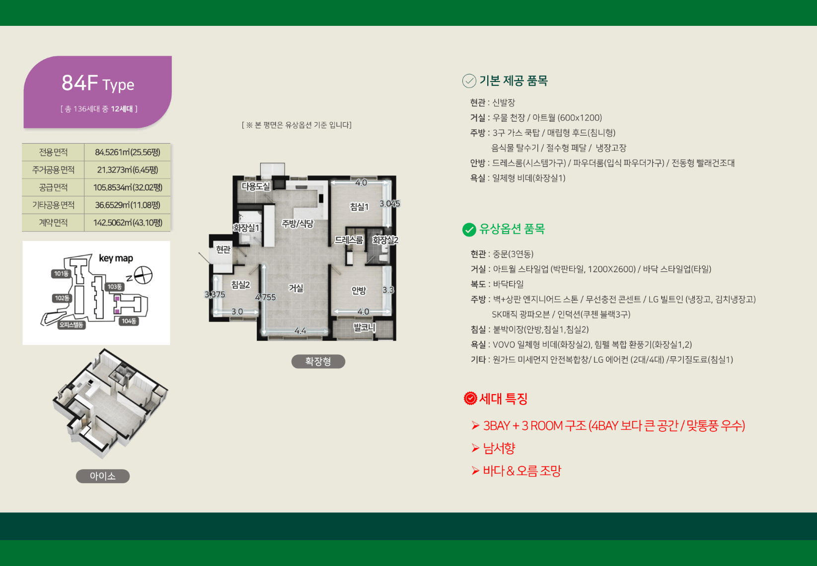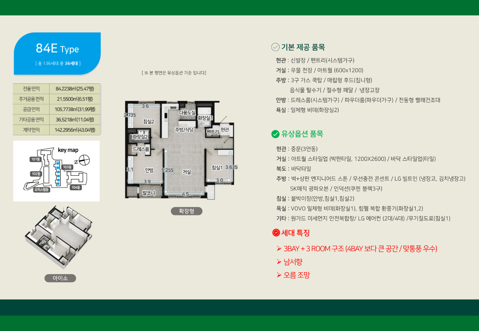 모든 세대가 3BAY + 3ROOM 구조로 설계되어, 공간 활용이 뛰어나고 가족 구성원에 맞게 효율적으로 사용할 수 있습니다. 대표적인 84㎡ 타입은 실사용 면적이 약 30평 내외로, 거실과 주방이 넓게 연결되어 있어 생활의 중심이 되는 공간을 더욱 빛나게 합니다.