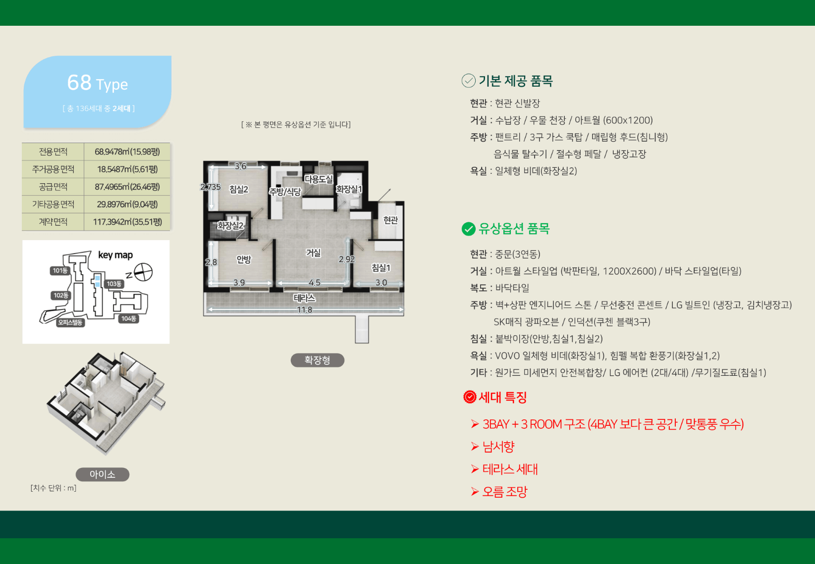또한 일부 세대는 테라스 구조나 110㎡ 이상의 대형 평형도 마련되어 있어 다양한 수요층을 충족시킵니다. 신혼부부부터 자녀를 둔 가족, 그리고 세컨하우스를 찾는 분들까지 모두 선택할 수 있는 옵션이 있다는 점이 큰 장점입니다.