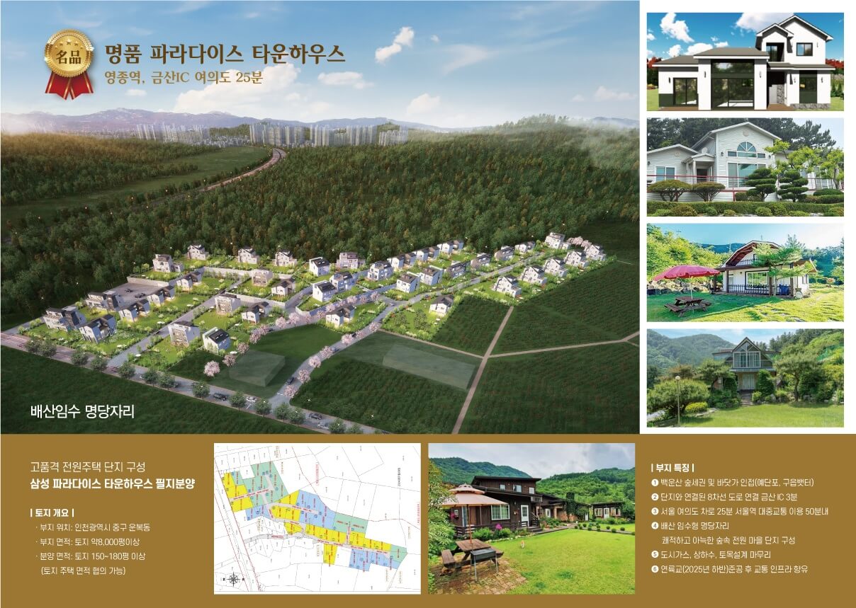 삼성 파라다이스 타운하우스는 총 40필지 규모의 고품격 전원주택 단지로 설계되었습니다. 주변 복합 리조트 및 항공 관련 기업의 근무자 수요가 풍부하여 안정적인 배후 수요를 확보하고 있습니다.