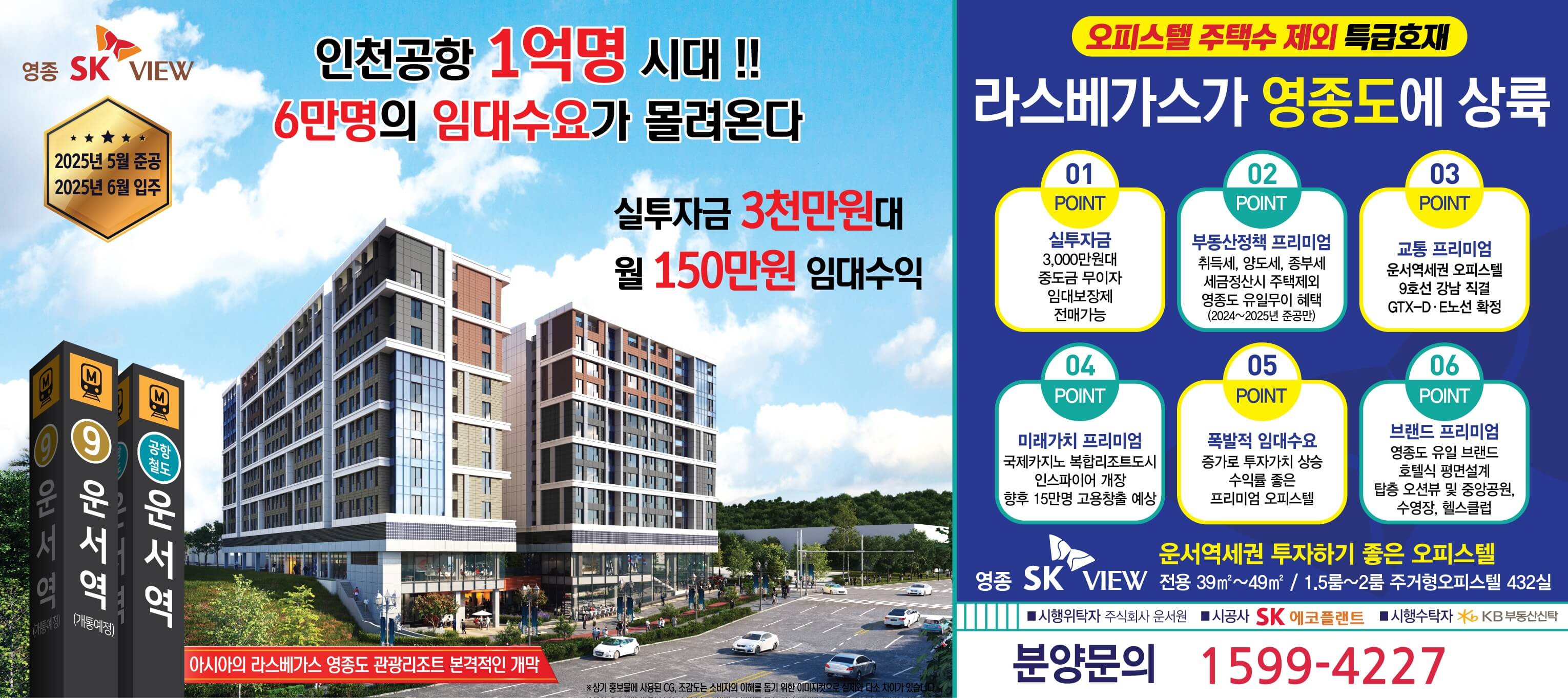 영종 SK뷰 오피스텔은 높은 수익률을 기대할 수 있는 투자처이자, 우수한 교통과 생활 인프라를 갖춘 실거주 공간으로 평가받고 있습니다. 특히, 인천국제공항과 복합리조트를 중심으로 한 지속적인 개발이 이루어지며, 장기적인 가치 상승이 전망됩니다.