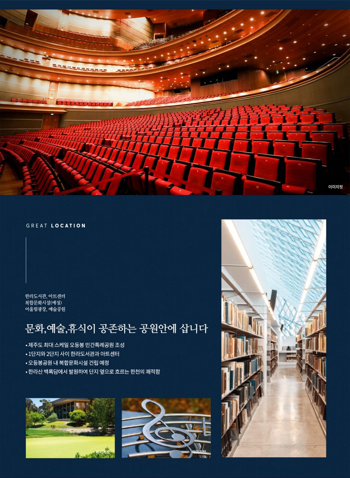 위파크 제주는 서제주와 동제주의 더블 생활권을 누릴 수 있는 입지적 장점을 갖추고 있습니다. 단지 인근에는 제주도청, 제주정부청사, 이마트, 롯데마트 등 다양한 생활 인프라가 밀집해 있습니다. 또한, 1단지와 2단지 사이에는 한라도서관, 아트센터 및 복합문화시설이 예정되어 있어 문화생활을 즐길 수 있습니다.