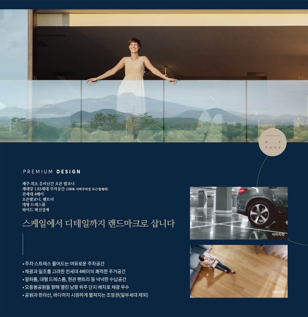 위파크 제주는 남향 위주로 단지를 배치하고 맞통풍 구조의 4베이 판상형 평면 설계를 적용해 채광과 통풍이 뛰어납니다. 제주도 최초로 전 세대 유리난간과 오픈발코니(일부 타입)를 적용해 개방감과 쾌적한 주거환경을 제공합니다. 가변형 벽체를 활용해 다양한 공간 연출이 가능하며, 주부의 가사 동선을 배려한 주방가구 배치, 대형 드레스룸, 현관 팬트리, 다용도실 등 다양한 수납공간과 오픈 발코니, 알파룸 등을 제공해 공간 활용도를 높였습니다.