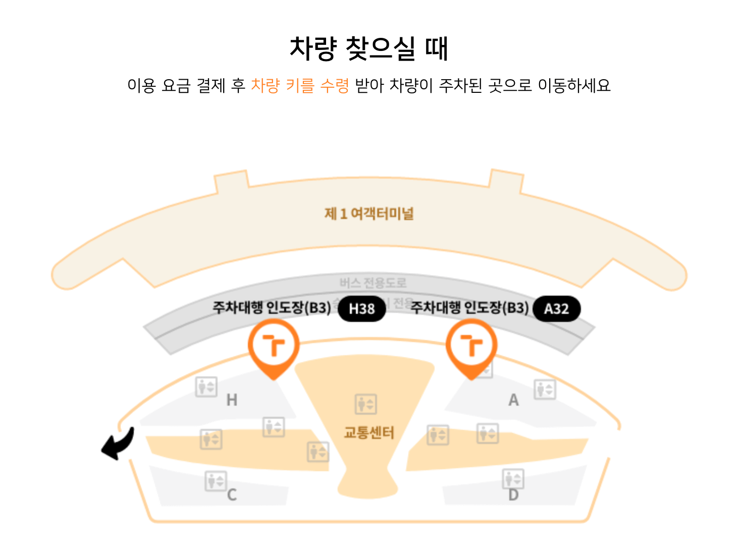 - H정산소: 서측 GATE 12번 지하 3층 38번 정산소