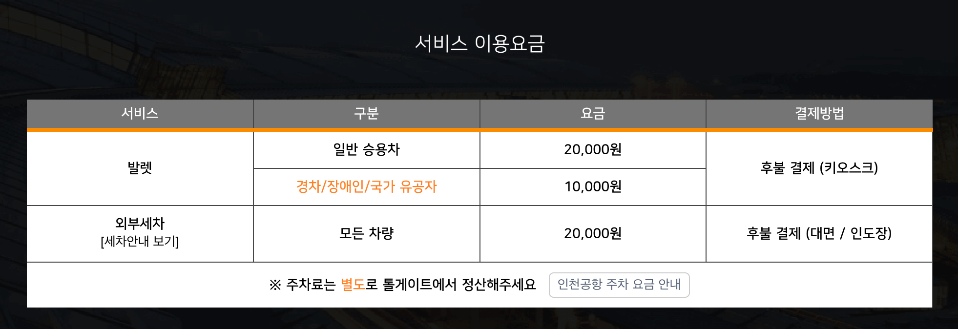 주차료는 별도입니다. 장기주차장 요금이 적용되며, 서비스 요금과 주차료는 후불로 정산됩니다.
