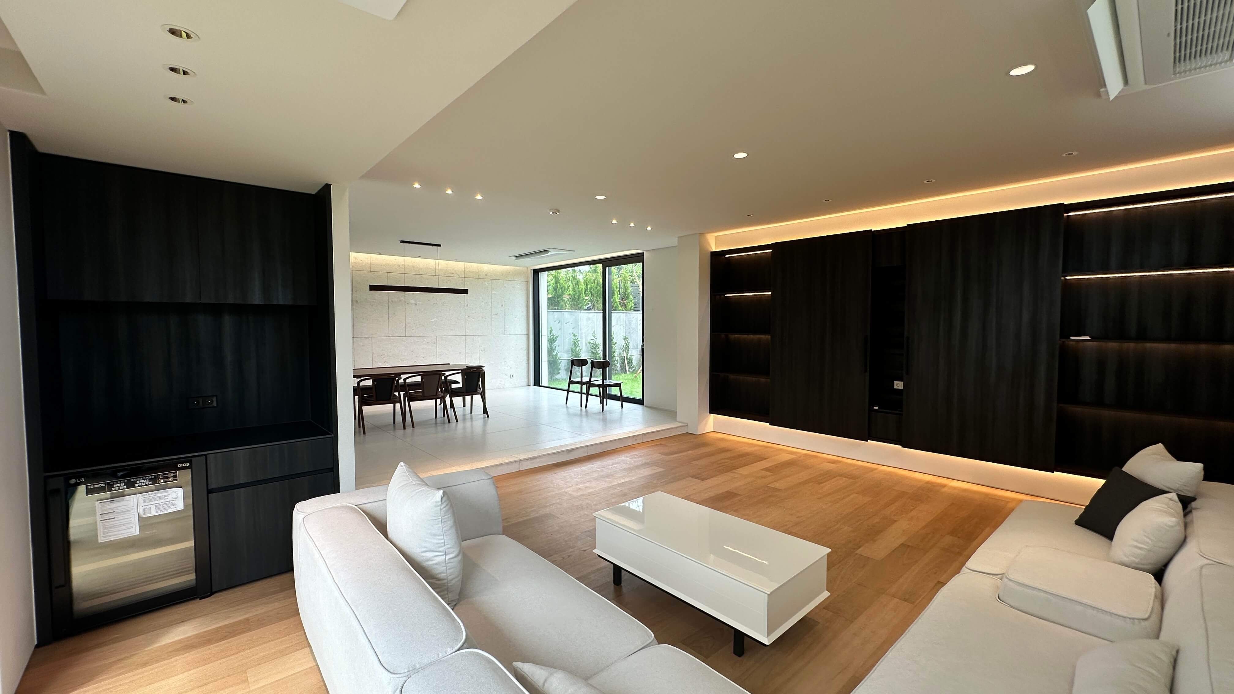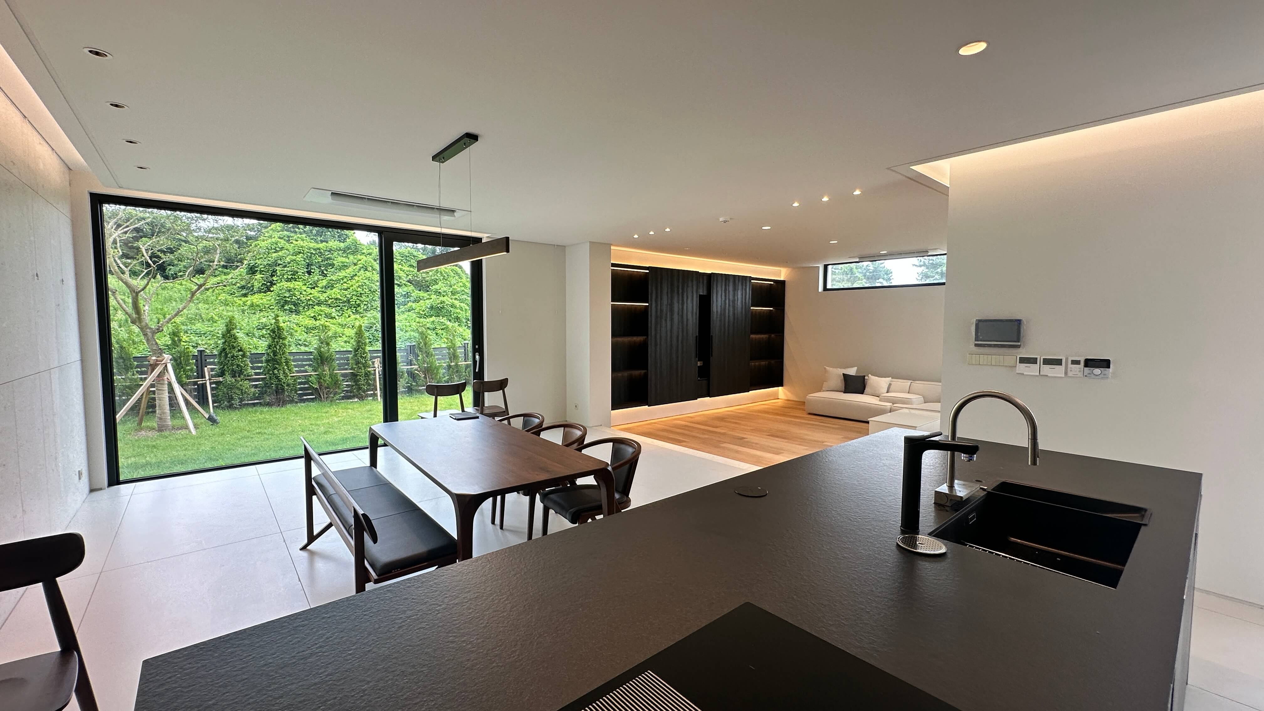 1층에는 거실, 주방, 팬트리, 보조 주방, 정원이 위치해 있습니다. 현관을 통해 들어서면 주방과 거실로 이어지는 통창이 시공되어 있어 개방감을 더해줍니다. 주방은 블랙 계통의 이태리 가구와 동선을 고려한 11자 구조로 설계되었으며, 모든 주방 가전은 빌트인으로 제공됩니다. 팬트리와 보조 주방이 있어 식재료 등의 수납이 용이합니다. 바닥은 대리석으로 마감되었고, TV장과 가구는 이태리 제품으로 시공되었습니다.