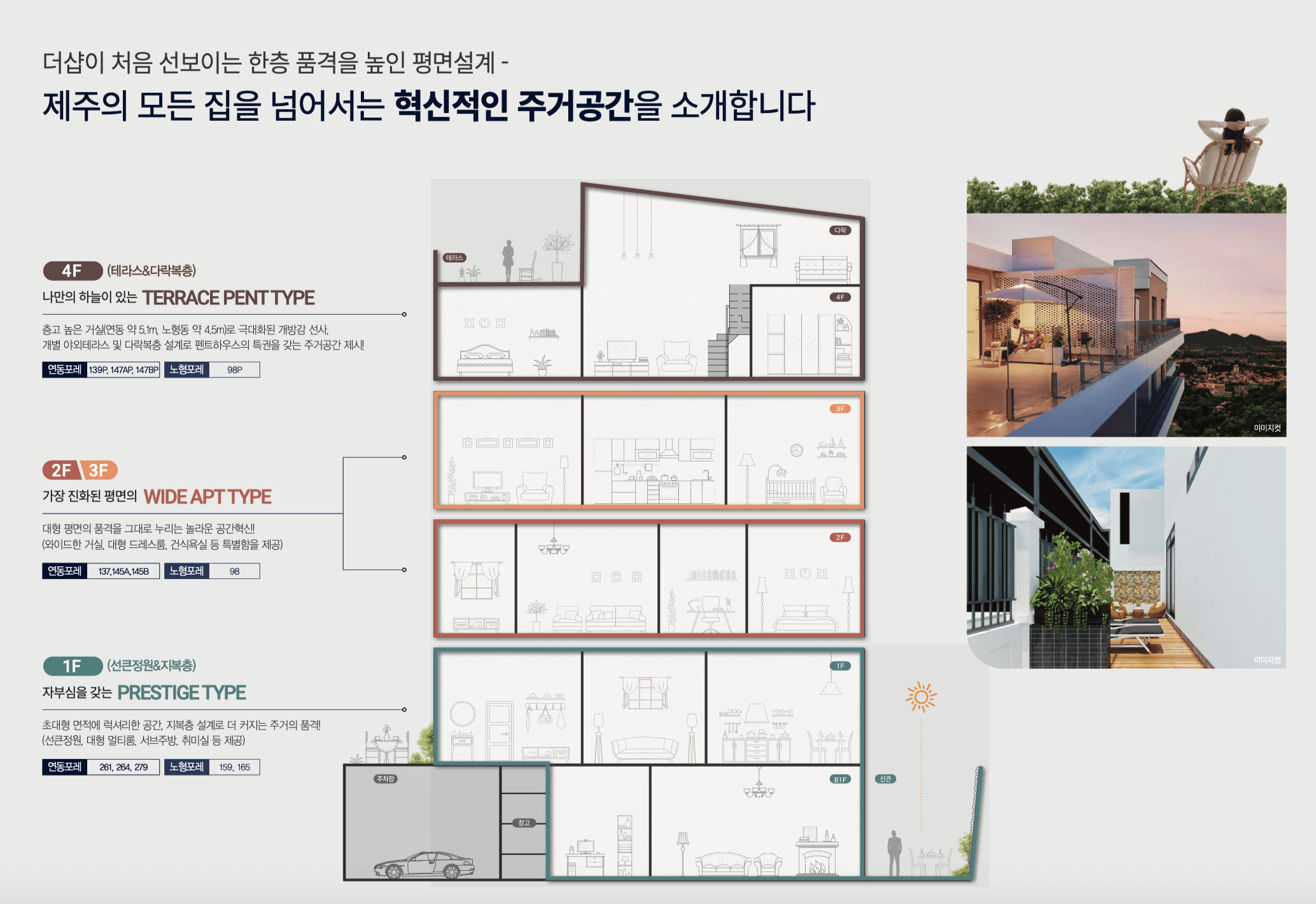 특히 4.5Bay 설계로 채광과 통풍이 우수하며, 1층 세대는 지하와 연결된 지복층 구조로 넓은 정원과 야외 바비큐 공간을 제공, 자연과 함께하는 여유로운 생활을 누릴 수 있습니다. 이러한 특화 설계 덕분에 제주도 미분양 아파트 중에서도 차별화된 주거 환경을 제공하고 있습니다.