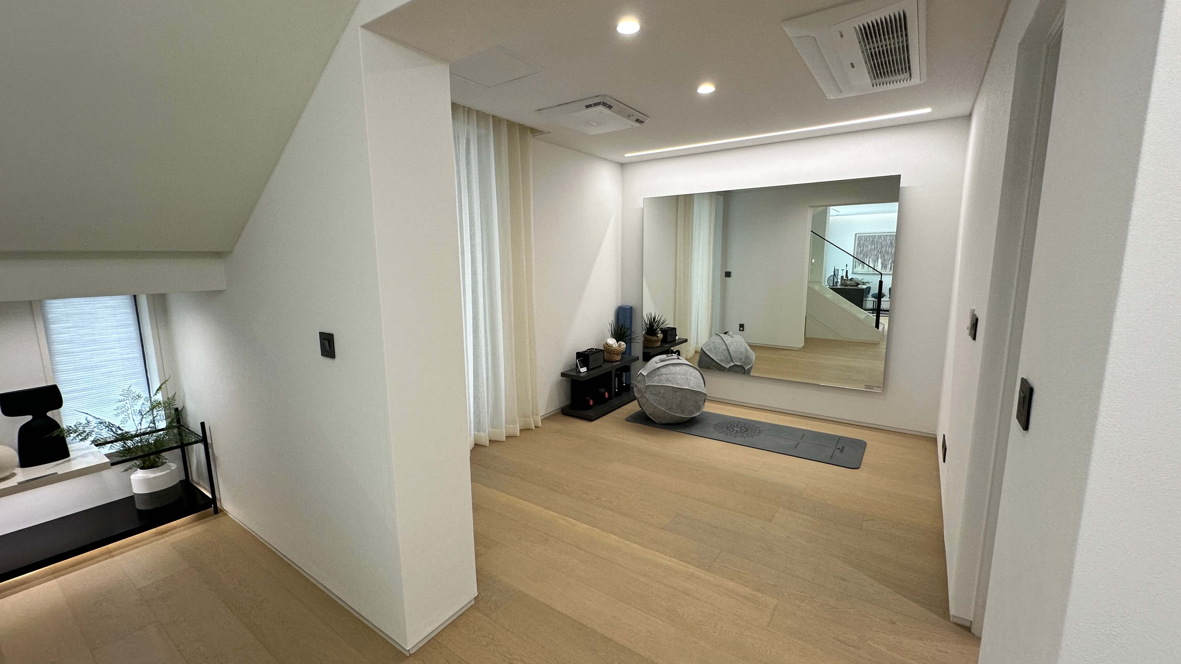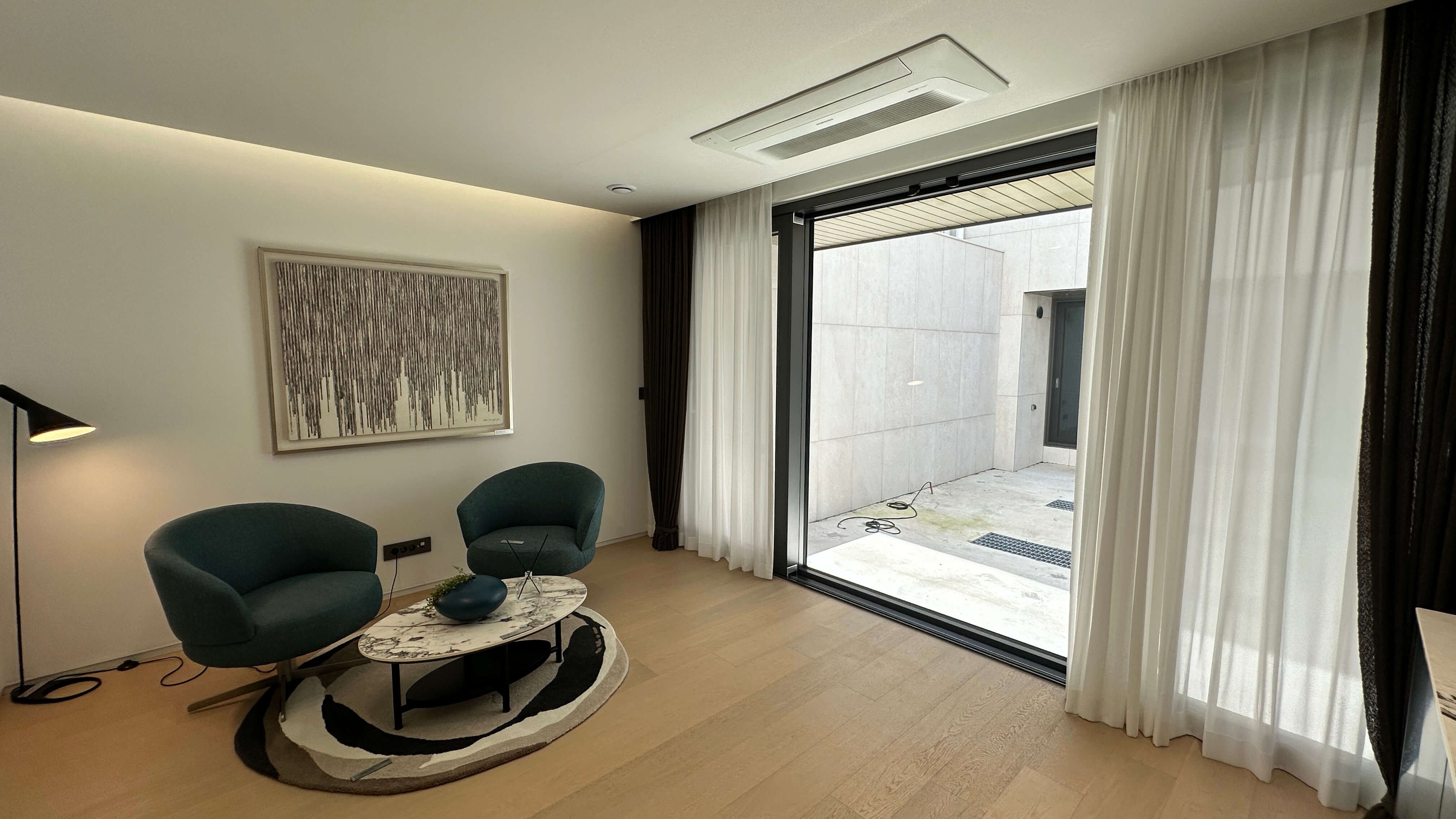 지하층은 입주민이 개인 운동실이나 빔 프로젝터를 설치하여 작은 영화관으로 활용할 수 있는 여유 공간을 제공합니다. 외부와 연결된 넓은 테라스와 함께, 샤워실이 갖춰져 있어 운동 후 휴식을 취할 수 있는 개인 공간으로 이상적입니다. 다만 역류 방지를 위해 좌변기는 설치되지 않았습니다.