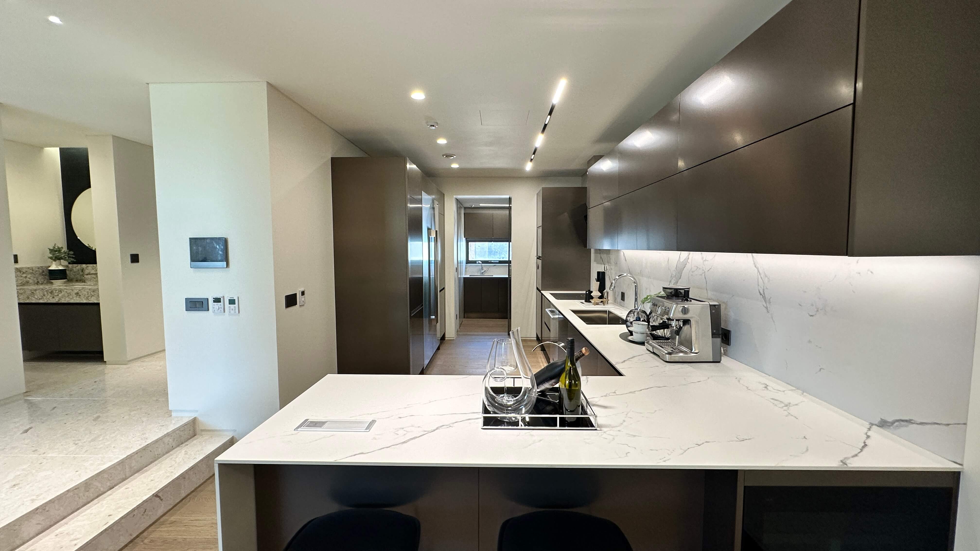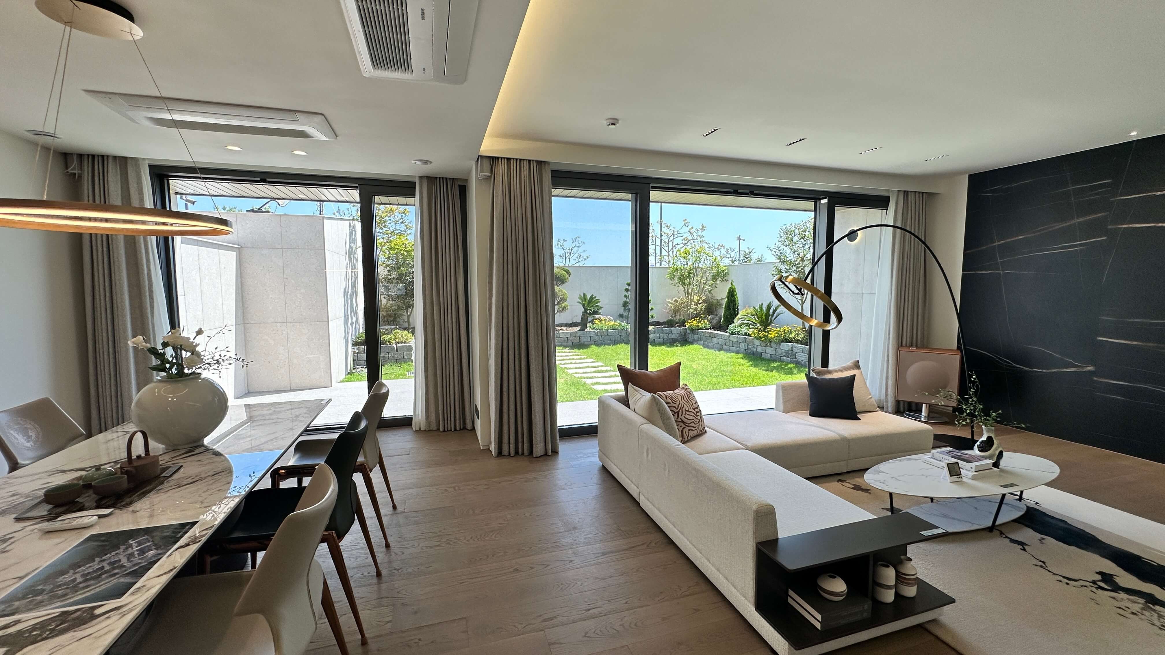 포레팰리스 타운하우스의 1층은 넓은 거실과 고급 주방, 다용도실로 구성되어 있습니다. 거실은 탁 트인 창을 통해 잔디마당과 연결되어 있어 개방감이 뛰어나고, 자연 채광이 들어와 따뜻하고 편안한 분위기를 조성합니다. 주방은 LG 시그니처 빌트인 가전으로 구성되어 있으며, 보조주방 겸 세탁실에는 세탁기와 건조기, 넉넉한 팬트리가 마련되어 있습니다.