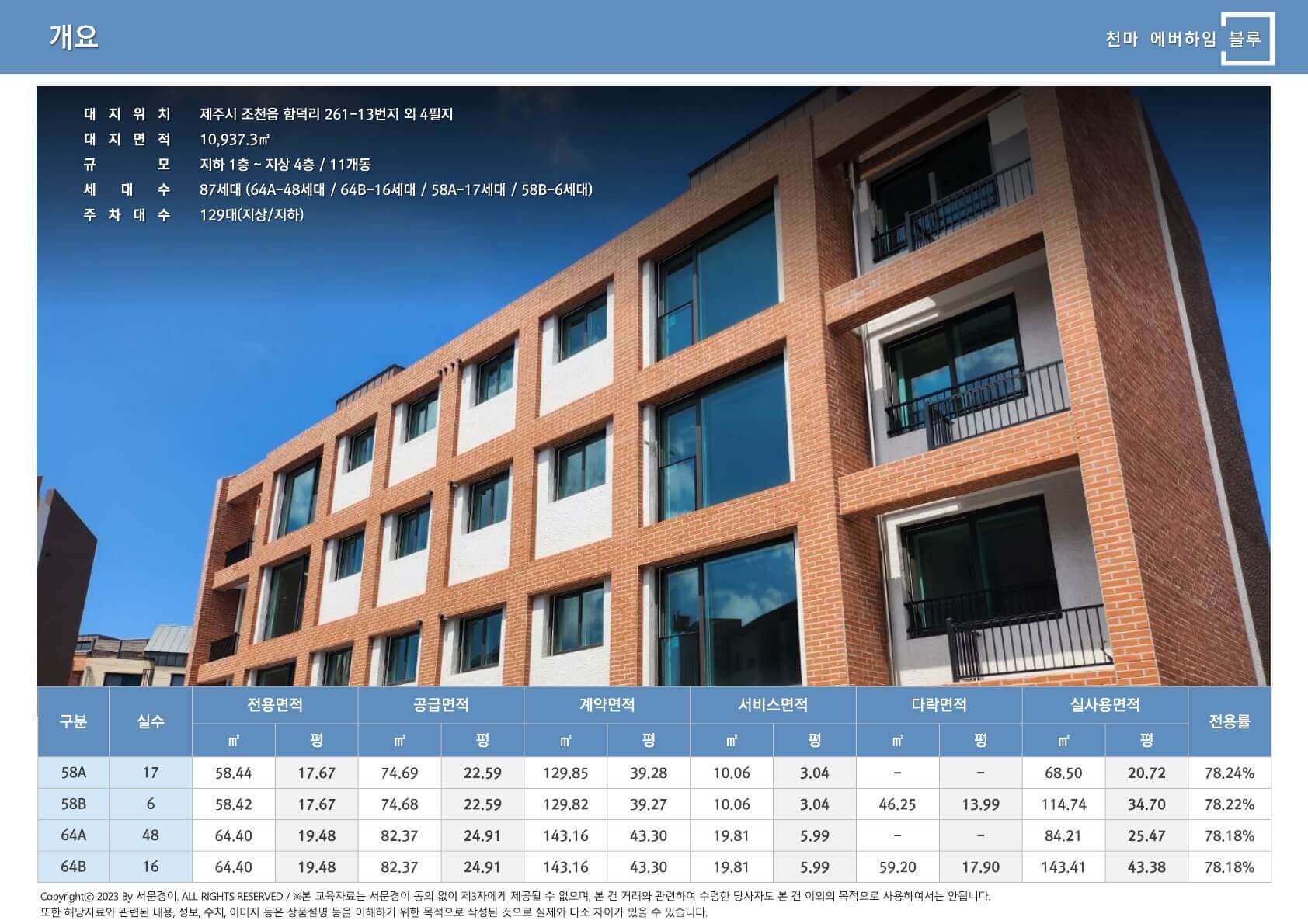 천마에버하임블루는 제주시 조천읍 함덕리에 위치하여 대지면적 약 10,939㎡에 걸쳐 지하 1층에서 지상 4층까지의 건물로 구성됩니다. 쾌적한 환경과 편리한 교통 인프라를 갖추고 있어 가족 단위 거주자와 투자자 모두에게 적합한 선택이 될 것입니다.