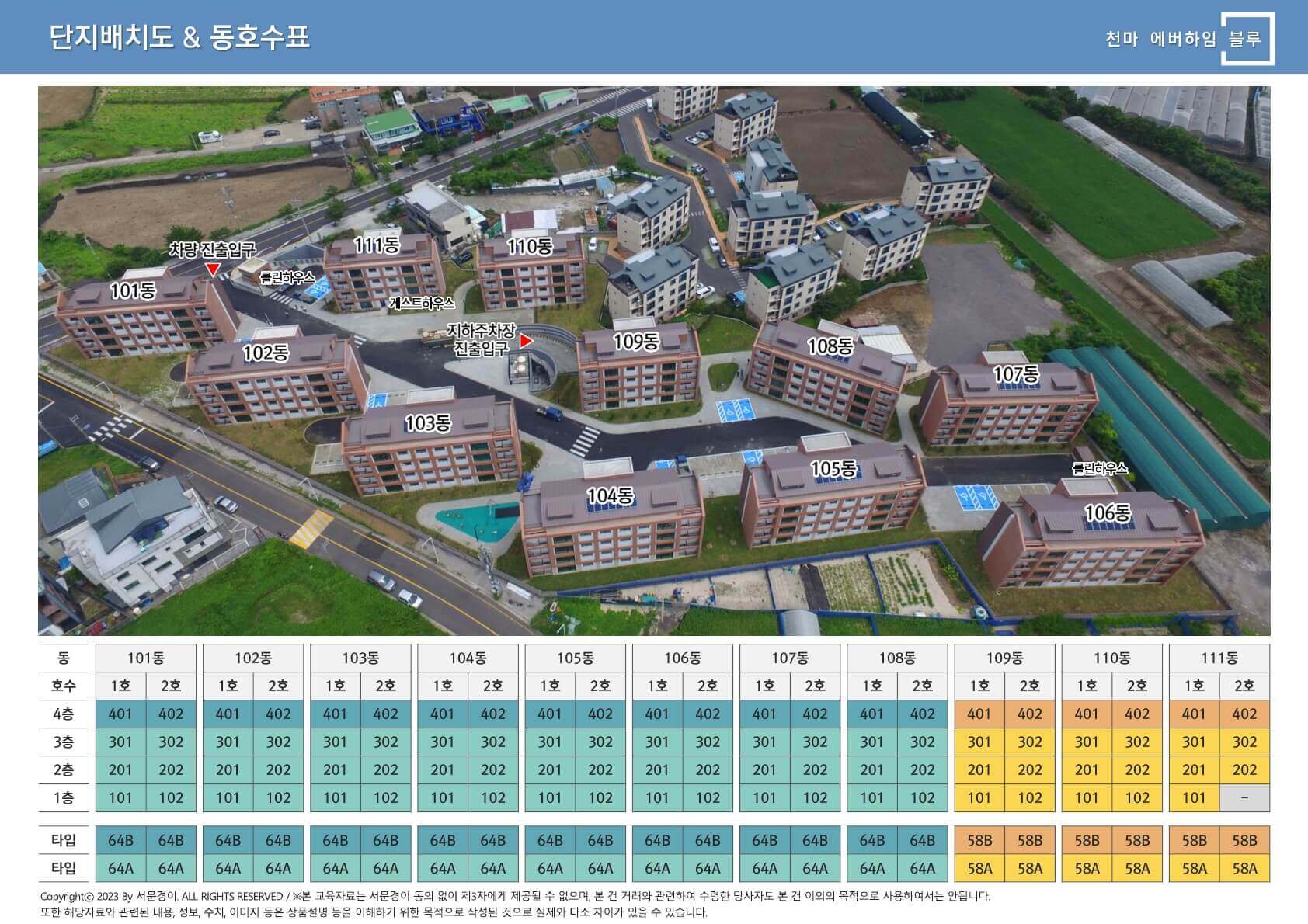 천마에버하임블루는 58㎡와 64㎡ 타입으로 제공되며 각각의 세대는 현대적이고 실용적인 공간 구성을 자랑합니다.