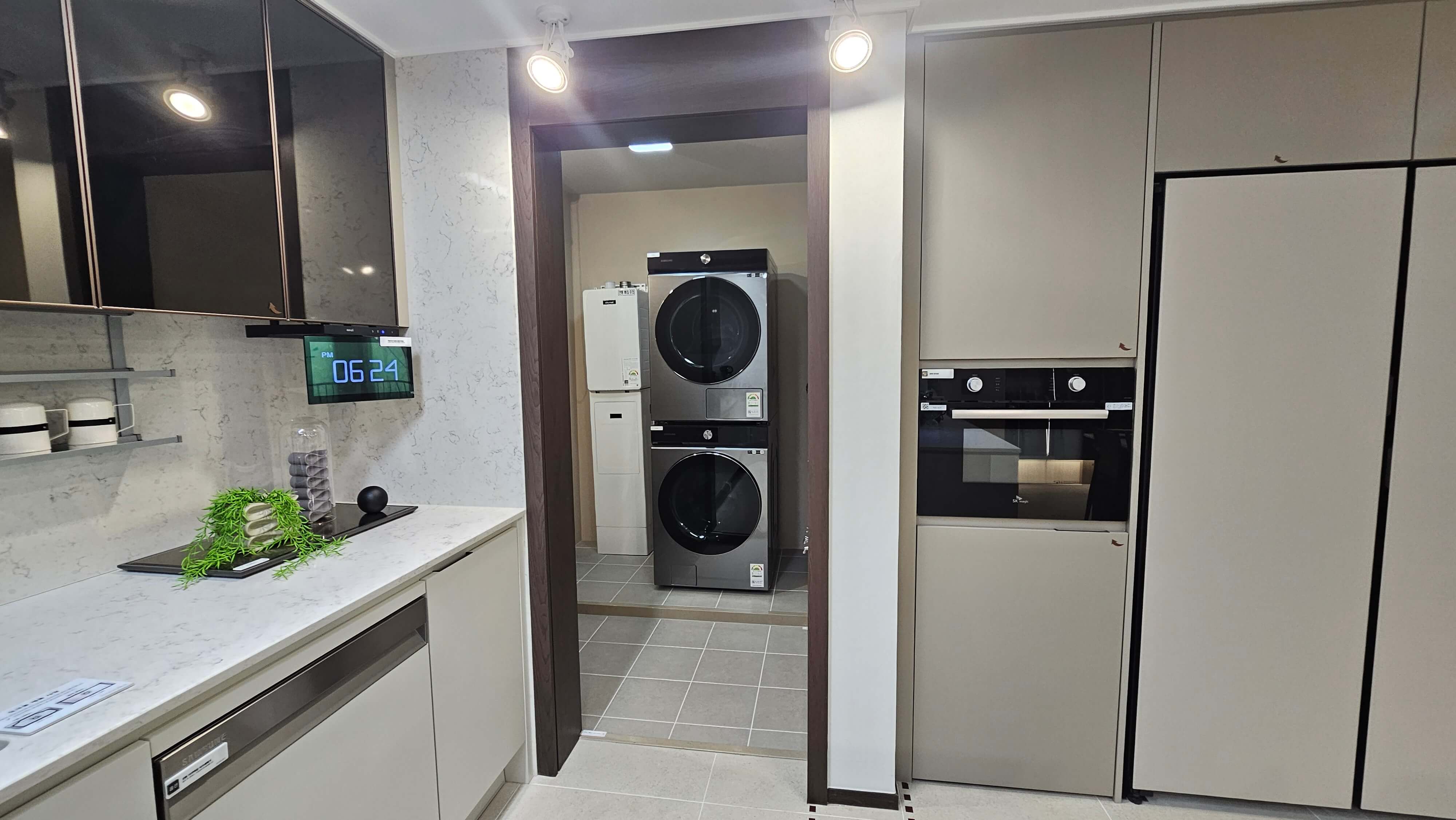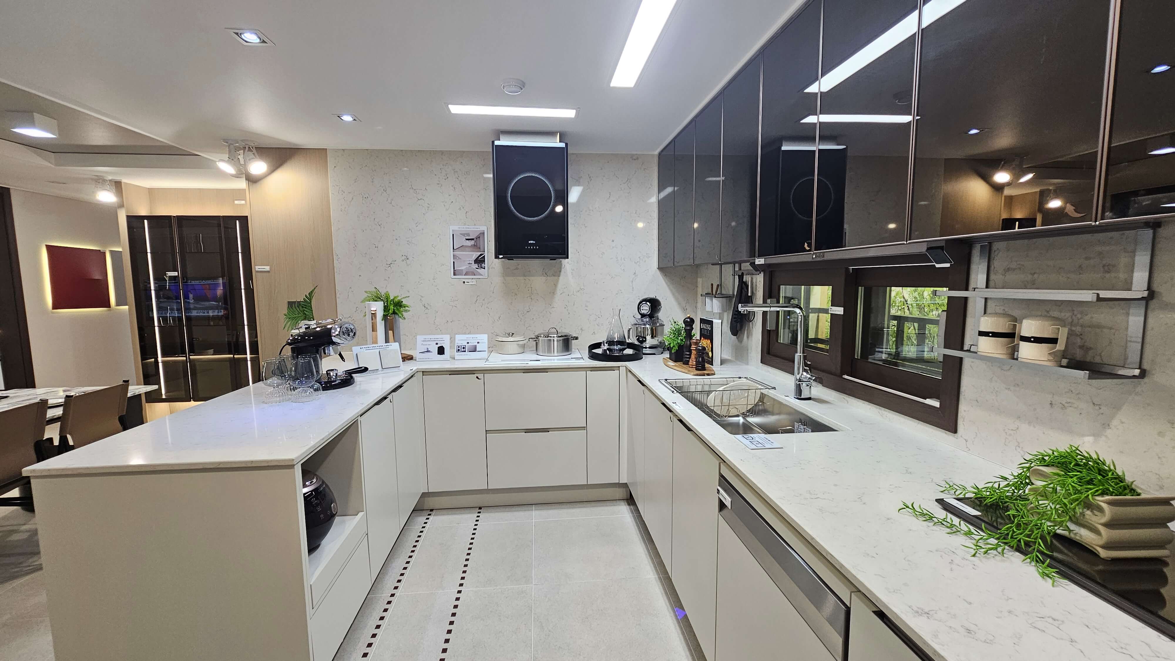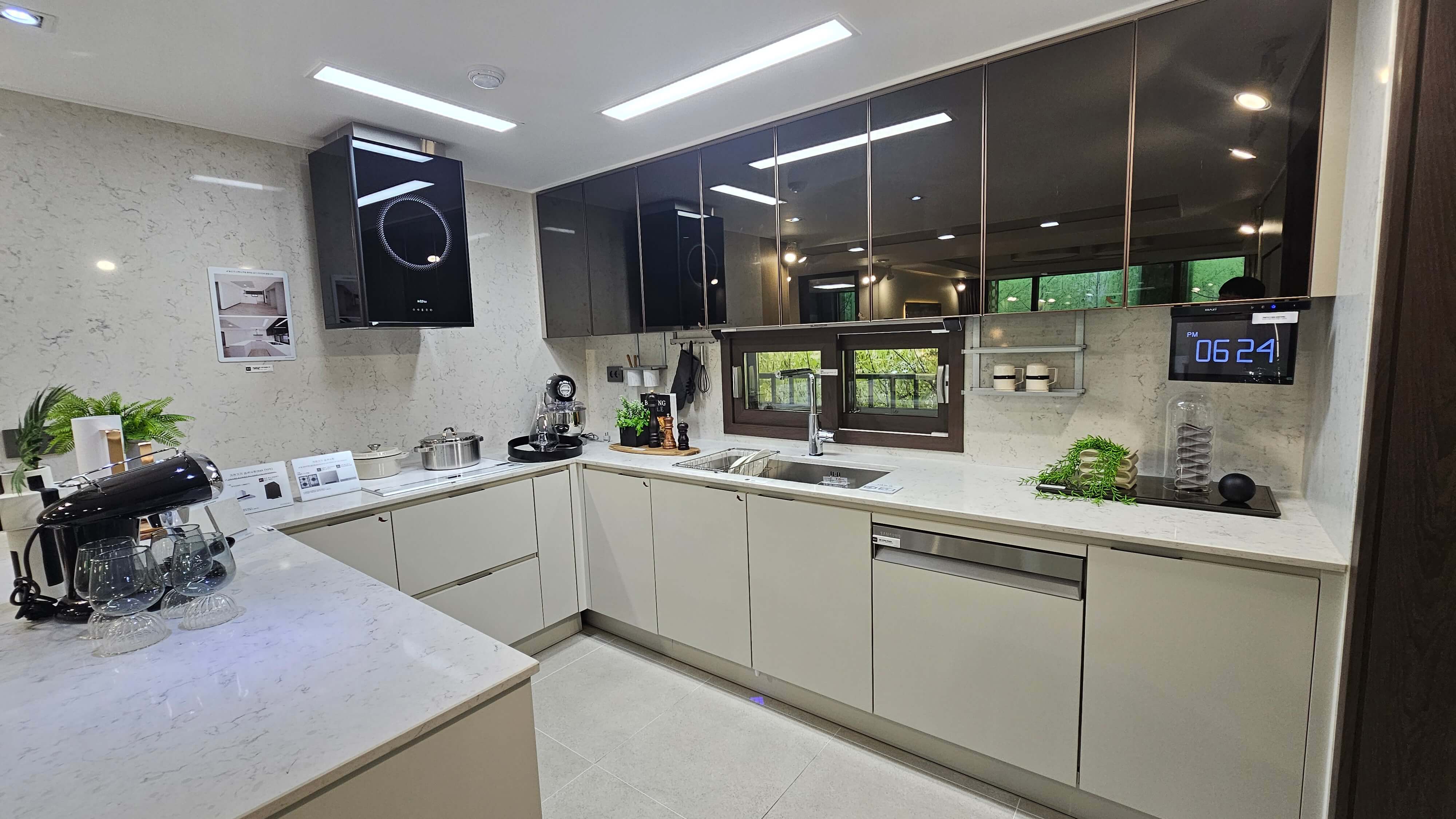 주방은 가족 중심의 생활에 맞춰 설계되어 있습니다. 아일랜드형 주방 구조는 단순한 조리 공간을 넘어 가족 간 커뮤니케이션 공간으로도 활용되며, 대형 식탁 배치가 가능한 거실과 자연스럽게 연결되어 있어 개방감과 기능성을 동시에 만족시킵니다. 상부장은 유광 글라스로 세련됨을 더했고, 하부장은 충분한 수납공간을 제공해 실생활에 매우 실용적입니다. 냉장고와 오븐 등의 가전도 빌트인으로 정리돼 있어 깔끔하고 고급스러운 주방 환경이 완성됩니다.