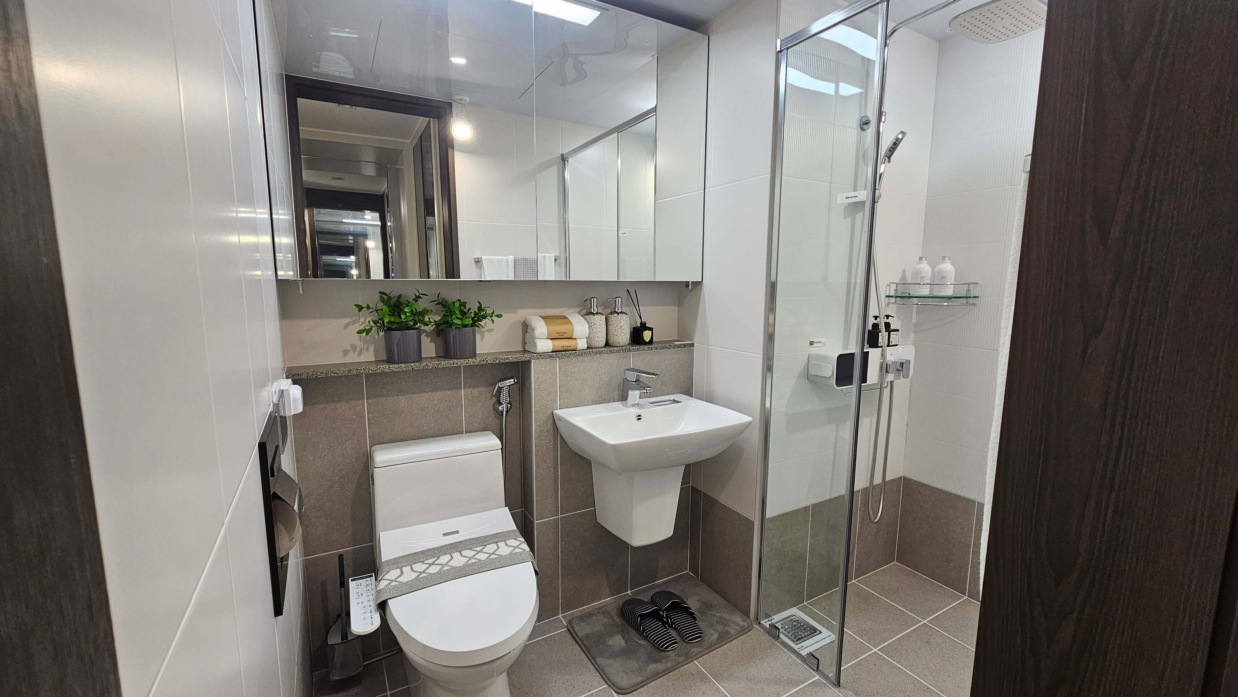 욕실은 모던한 그레이 톤 타일 마감으로 마치 호텔 욕실과 같은 분위기를 자아냅니다. 욕조는 피로를 푸는 공간으로 손색이 없고, 실용적으로 구성된 선반과 수납장이 정돈된 욕실 공간을 만들어줍니다. 전반적인 인테리어와 간접조명이 조화를 이루며 고급스러운 분위기를 더합니다.