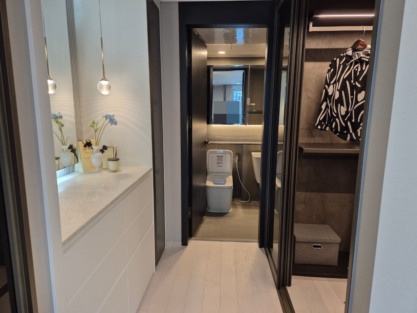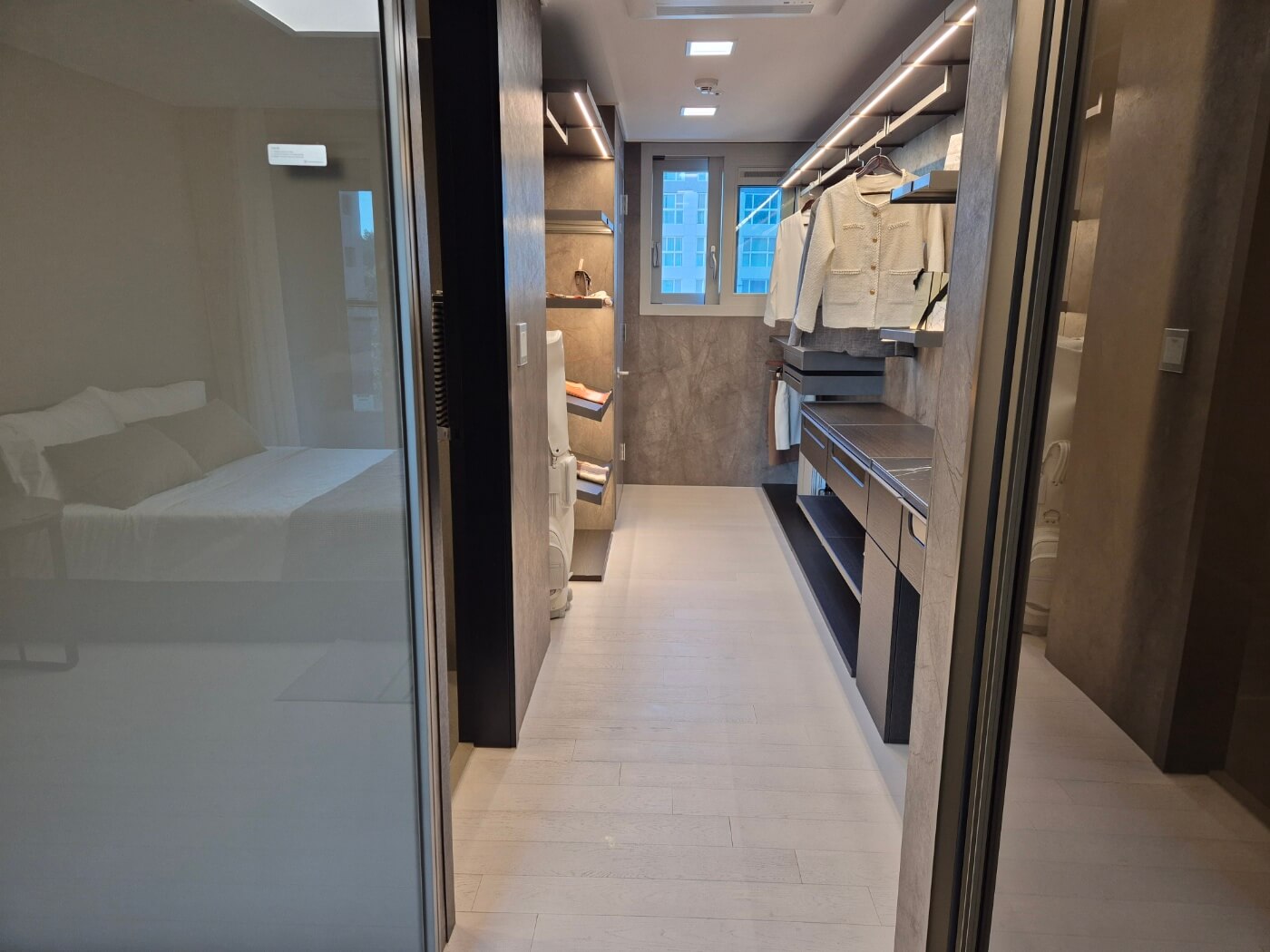 안방에는 드레스룸과 파우더 공간이 마련되어 있고, 현관에는 신발장과 별도의 펜트리가 설치됩니다. 자녀 방에는 기본 시스템 선반이 제공되어 활용도가 높습니다.