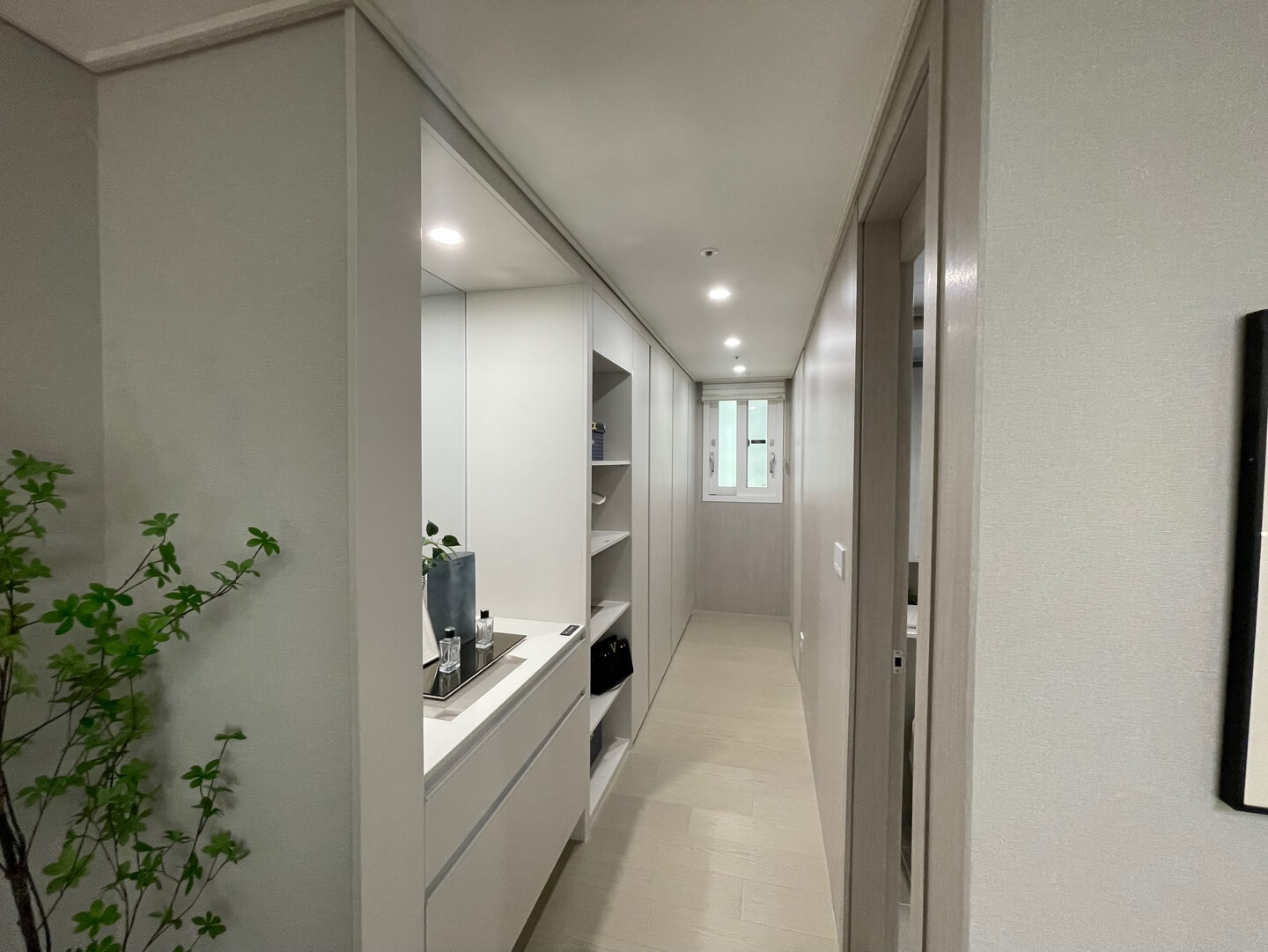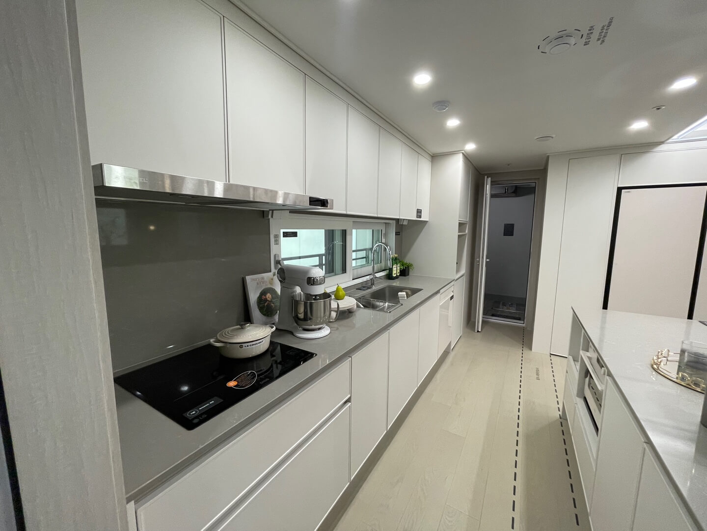 수납공간도 뛰어나며, 팬트리, 붙박이장, 드레스룸을 기본 제공하여 실거주 만족도를 더욱 높였습니다. 가사 동선을 고려한 보조 주방 및 세탁실 등의 설계도 적용되어 주부들에게 높은 선호도를 보일 것으로 예상됩니다.