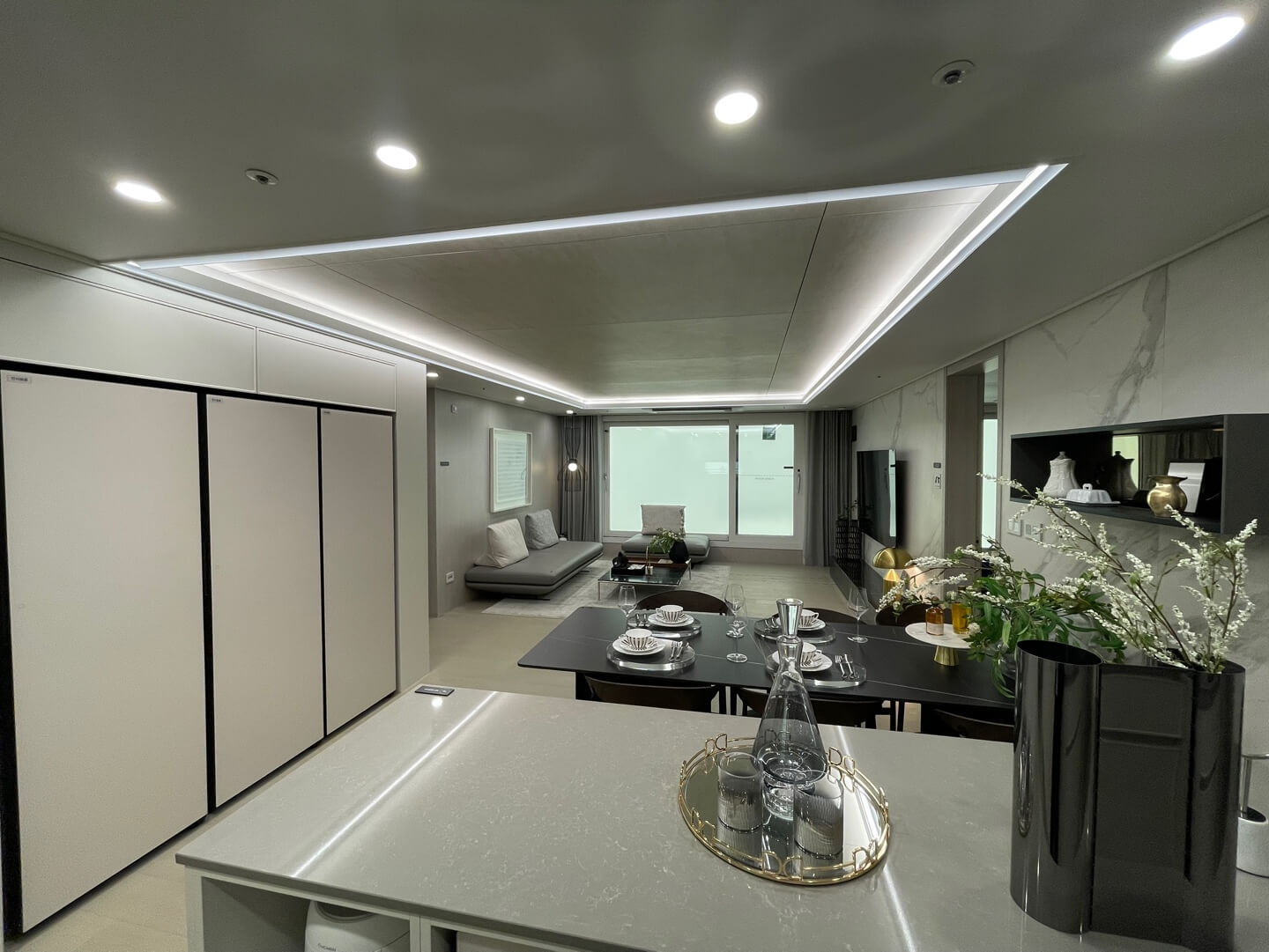 평촌 아크로 베스티뉴는 중소형 아파트에서 보기 힘든 고급 설계 및 마감재를 도입하여 차별화를 시도했습니다. 와이드 우물천장과 고급 아트월을 적용하여 주거 공간의 품격을 높였으며, 디밍 시스템을 도입해 조명의 밝기를 조절할 수 있도록 설계되었습니다.