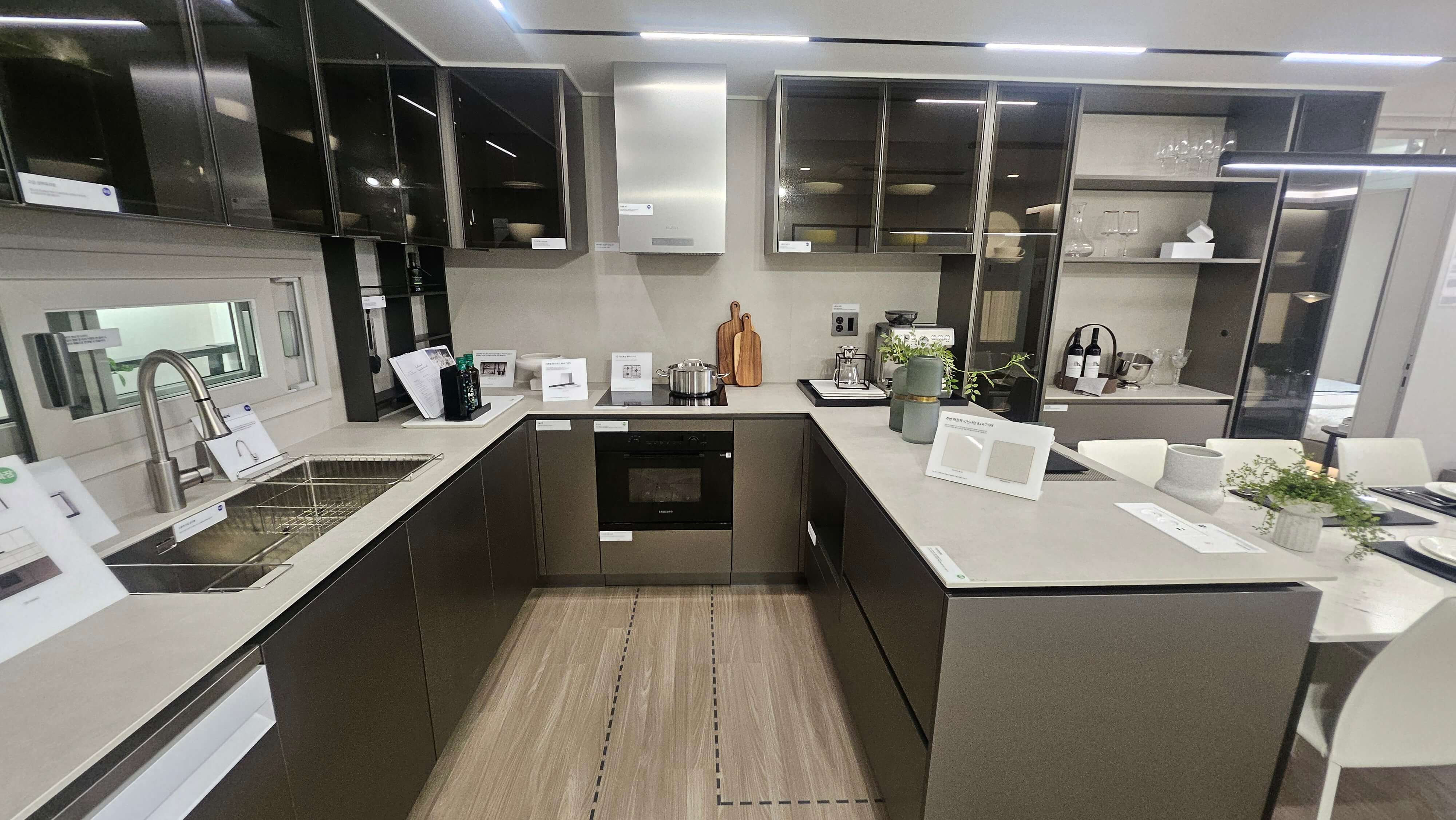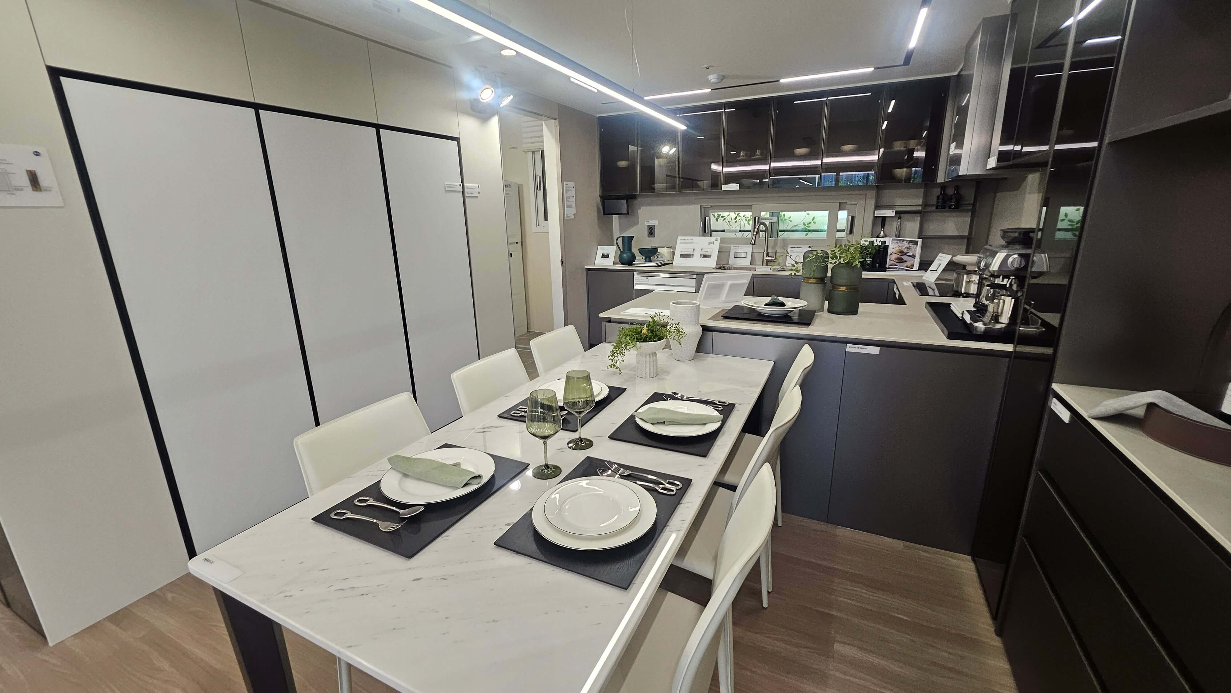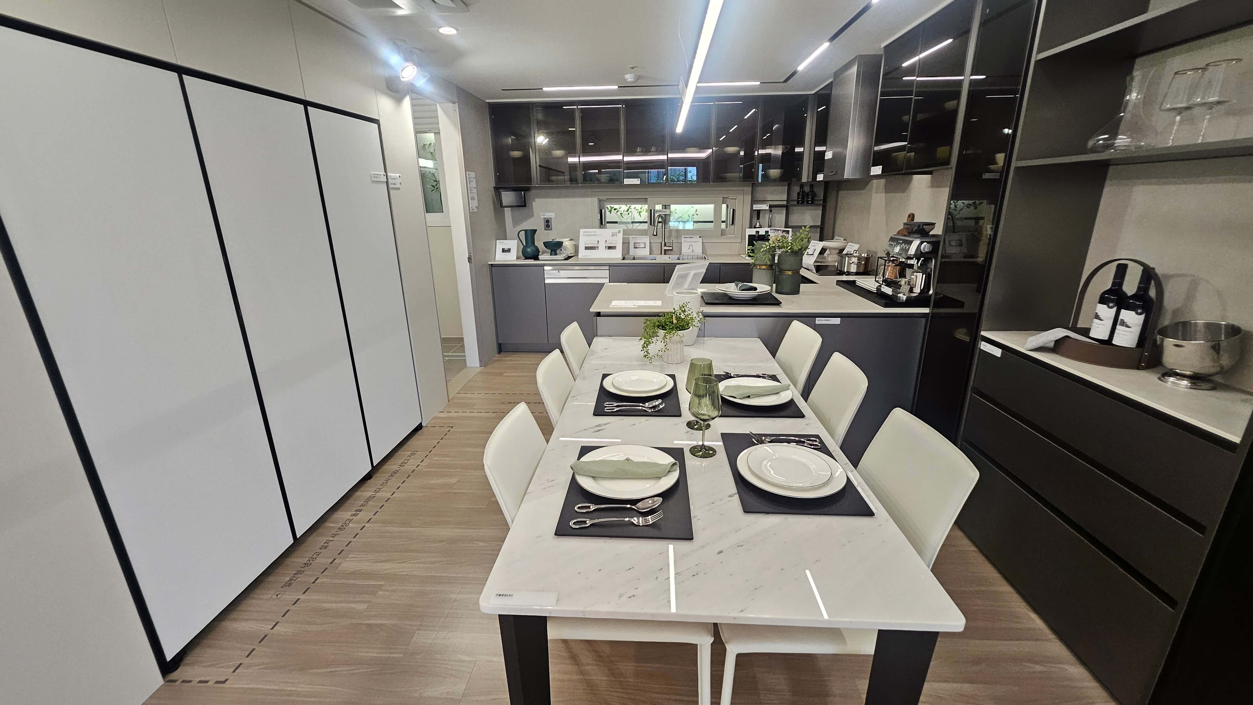 현관과 복도에는 2개의 팬트리를 배치해 수납 효율을 극대화했고, 주방은 ㄷ자형 배치로 다용도실과 연결됩니다. 발코니 확장 시 제공되는 기본 품목(팬트리 시스템 가구, 침실 붙박이장, 엔지니어드 상판 등)은 입주자의 만족도를 높여줍니다.